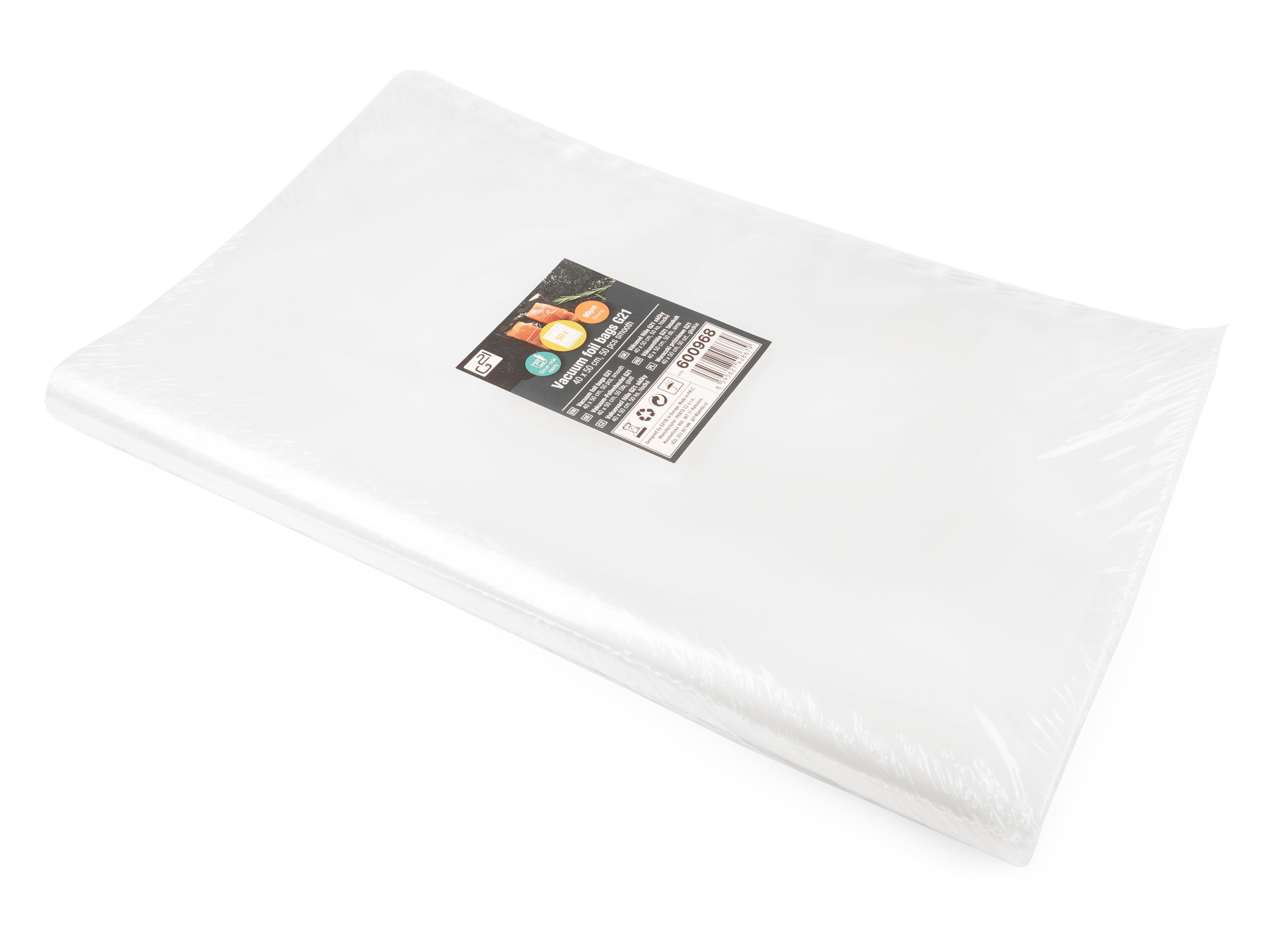 Hladké vakuovací sáčky v síle 90 µm o rozměrech 40 x 50 cm, balení 50 ks. Univerzální využití v profesionálních komorových vakuovačkách. Pro sous-vide vakuování a prodloužení trvanlivosti potravin.