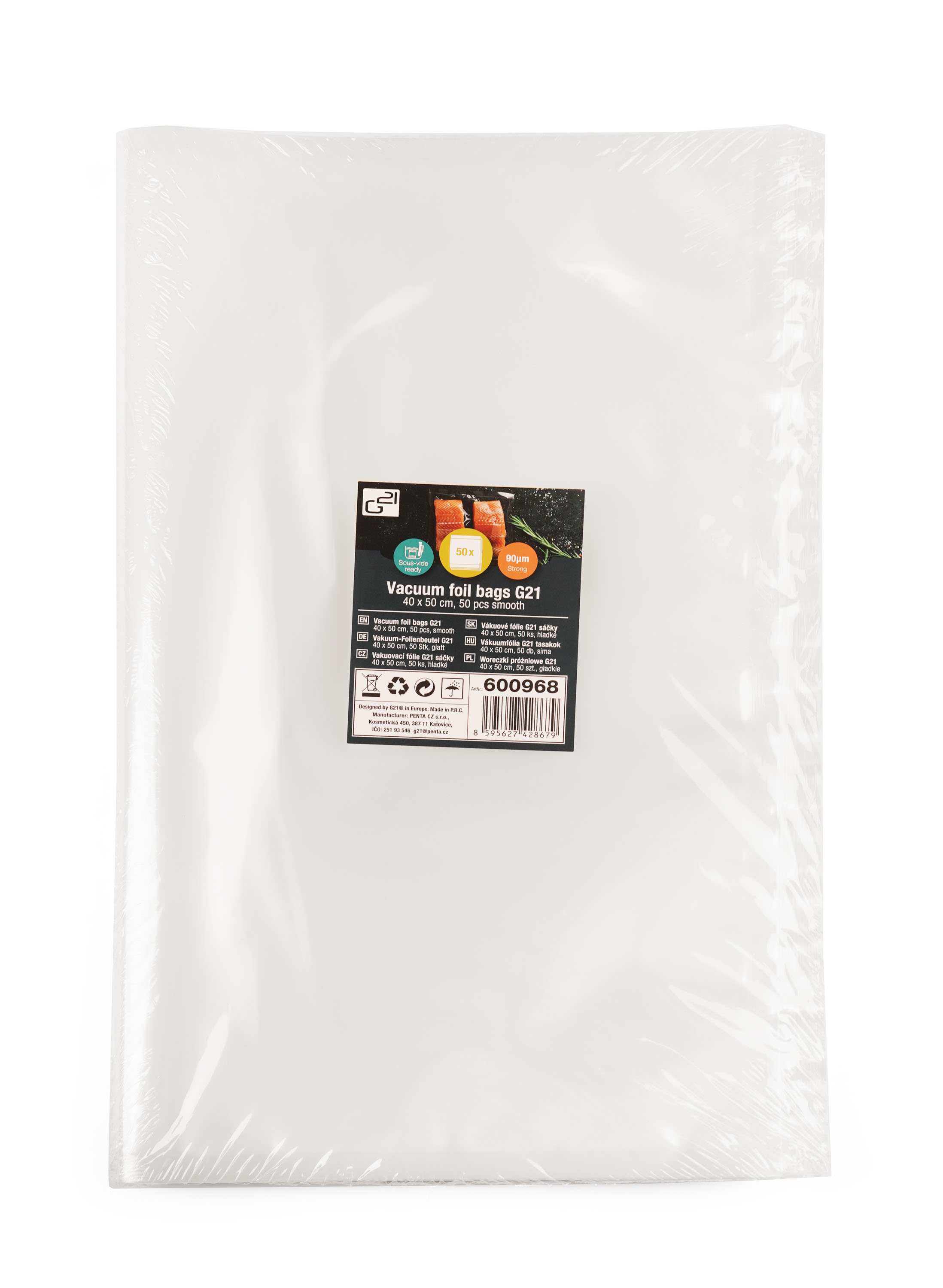 Hladké vakuovací sáčky G21 o rozměrech 40 x 50 cm jsou díky své vysoké pevnosti a kvalitnímu provedení vhodné nejen pro prodloužení trvanlivosti potravin vakuováním a jejich uchovávání v ledničce nebo v mrazáku, ale využijete je i k vakuování surovin pro sous-vide vaření.