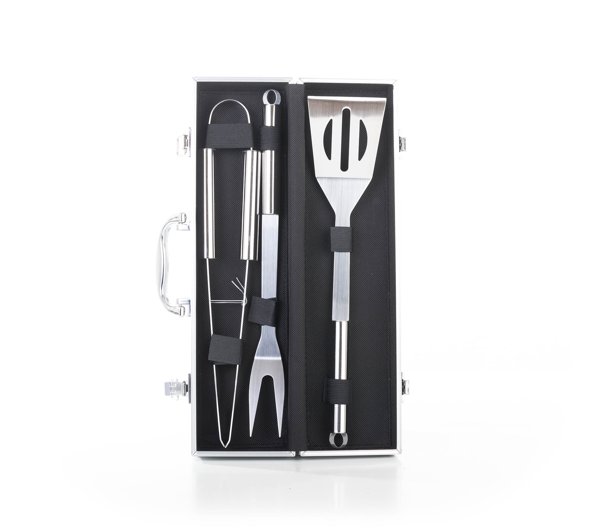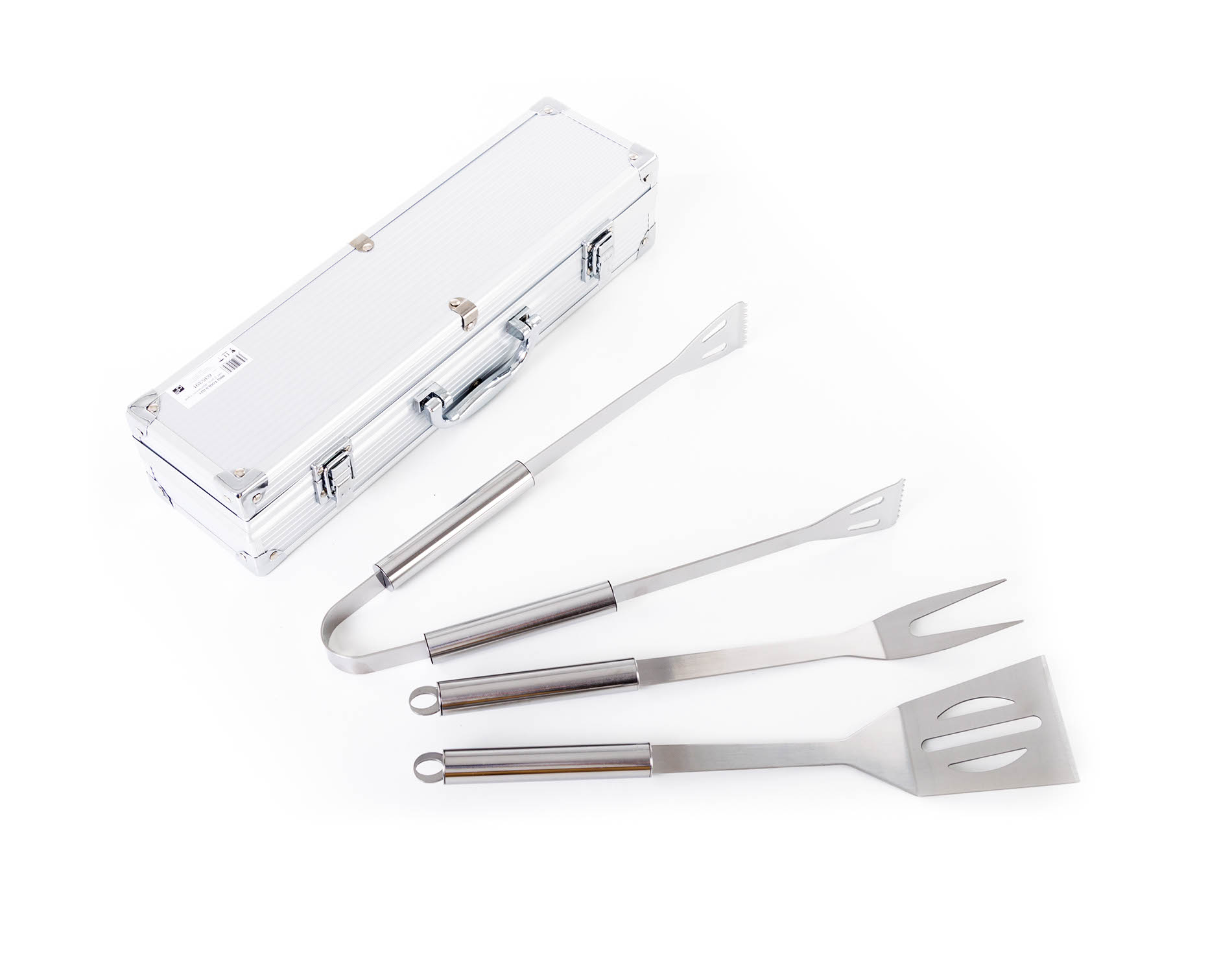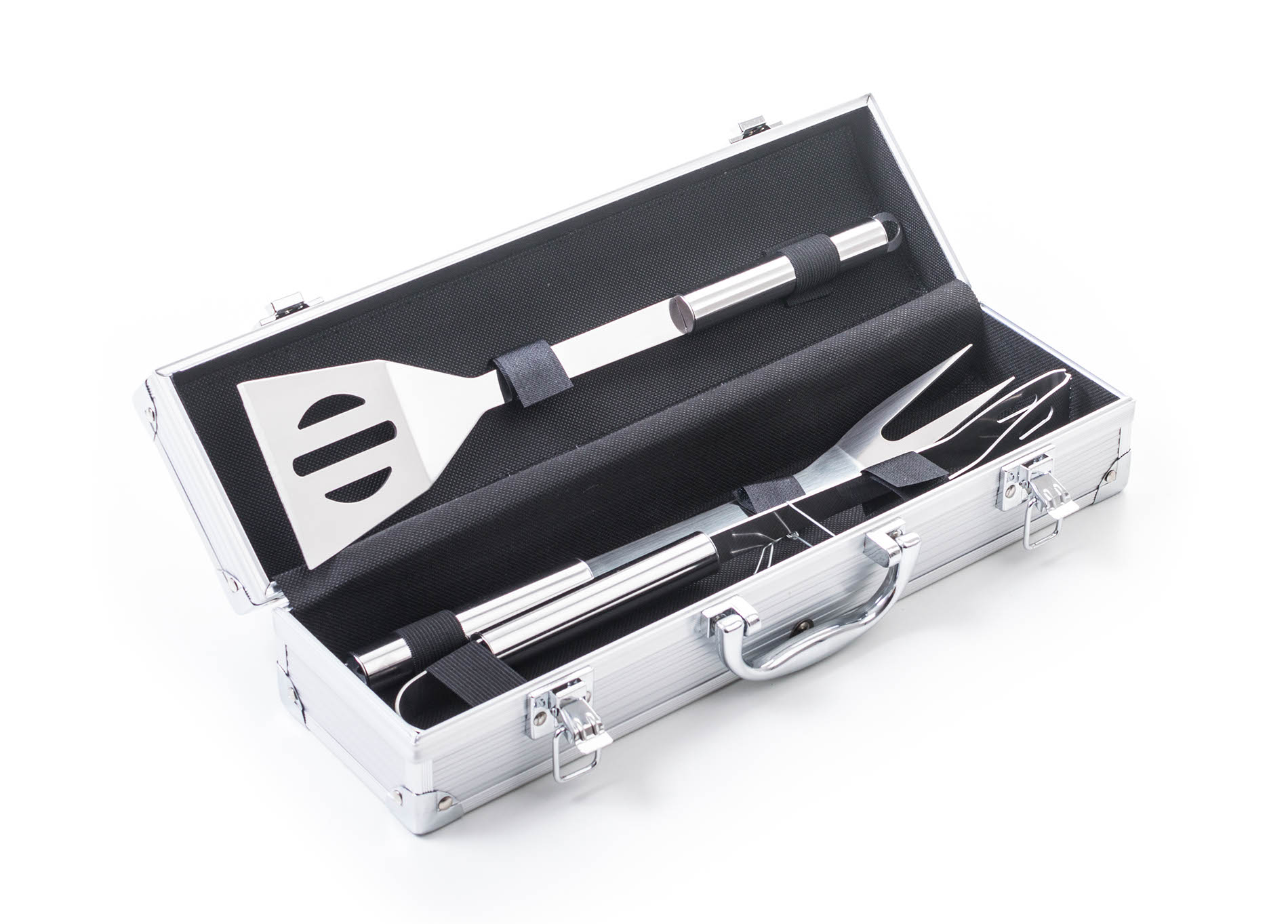 Sada obsahuje kompletní nástroje pro grilování bez potíží. Součástí sady je obracečka, vidlička a kleště o délce 34 cm. Pro snadné přenášení a skladování je nářadí uloženo do praktického hliníkového kufru.