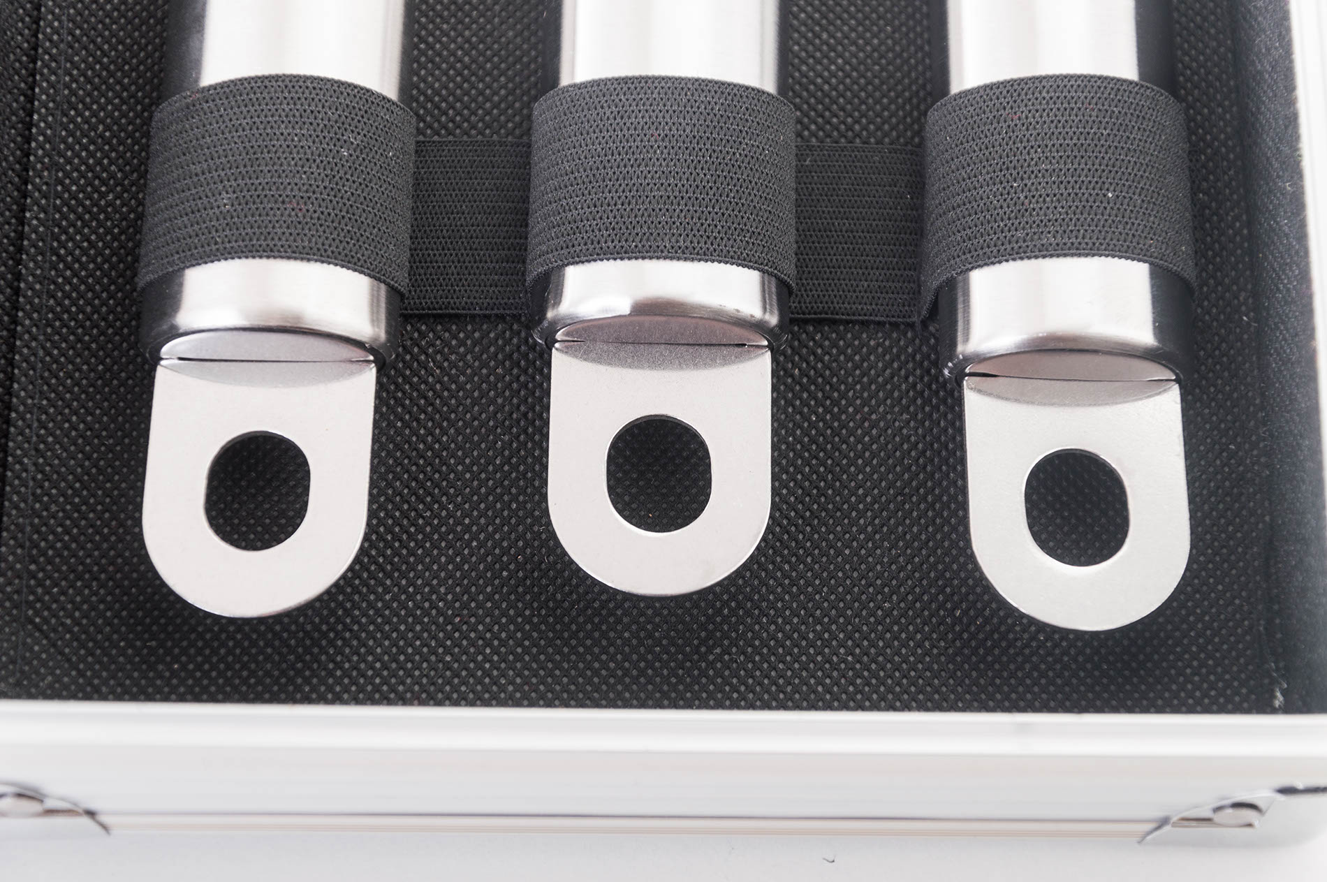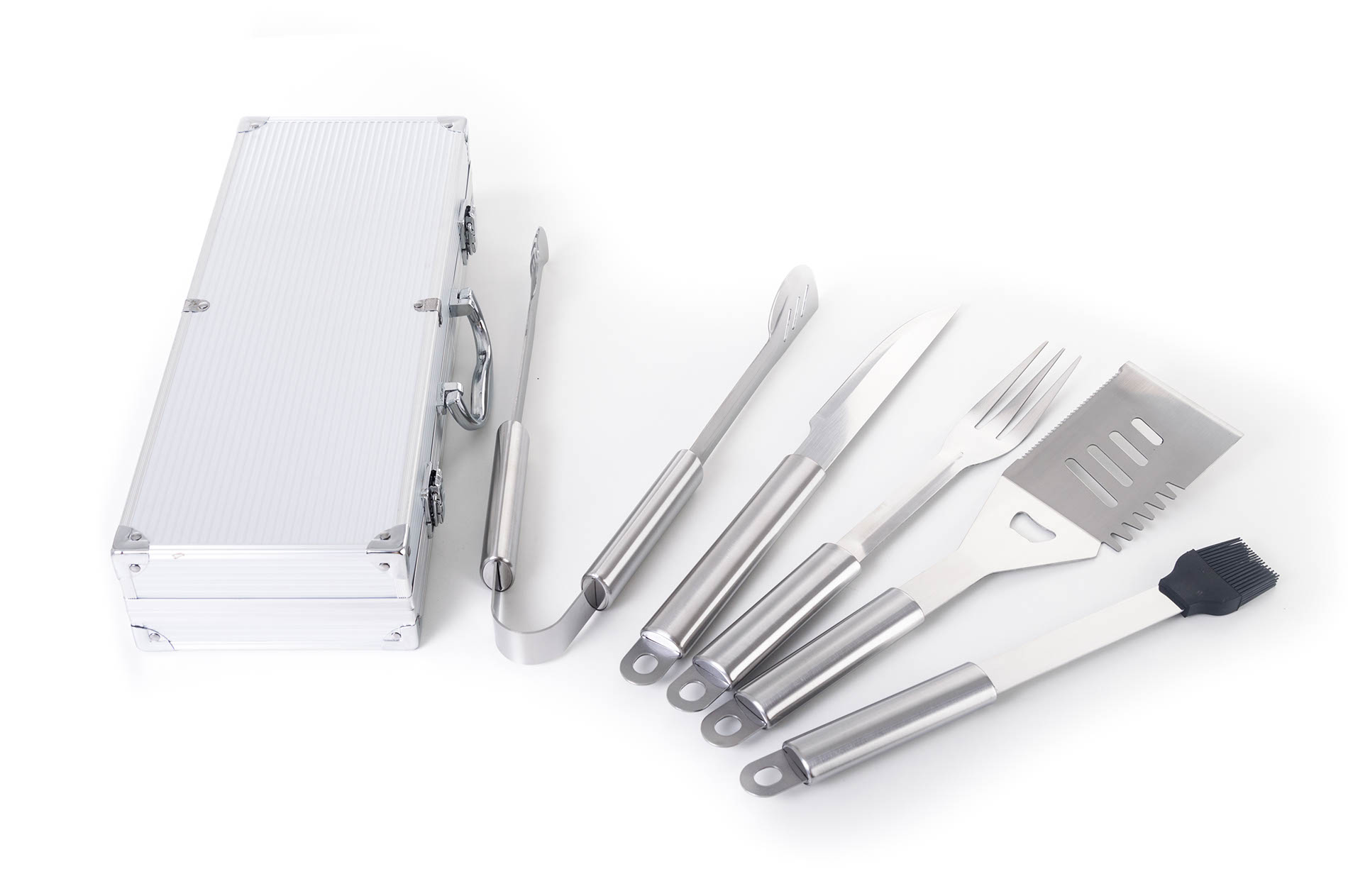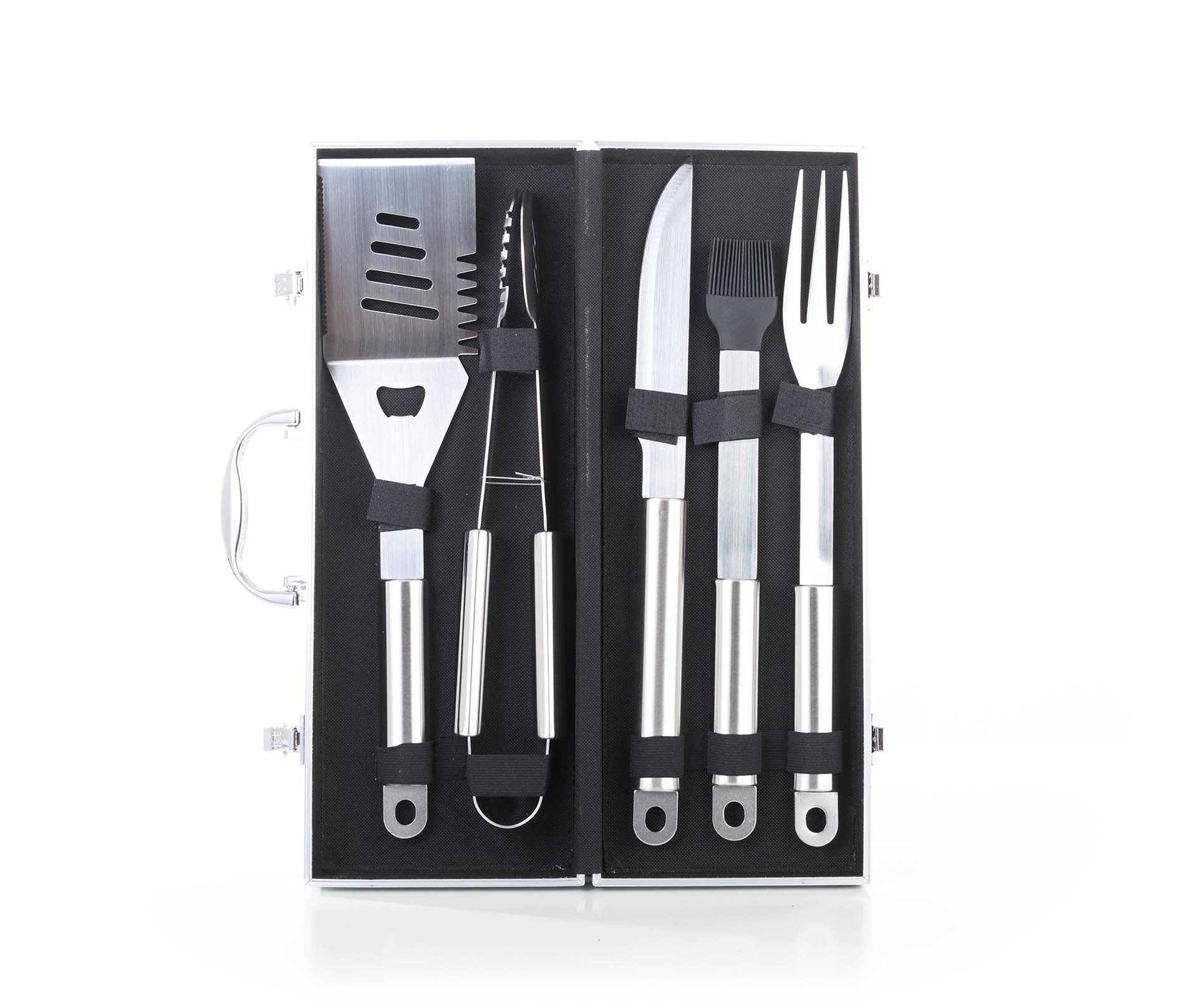 Sada obsahuje kompletní nástroje pro grilování bez potíží. Součástí sady je obracečka, vidlička, kleště, prodloužený grilovací nůž a štětec na potírání. Délka nářadí 40 cm zajišťuje, že na vás při grilování nebudou šlehat plameny ani prskat olej z masa. Pro snadné přenášení a skladování je nářadí uloženo do praktického hliníkového kufru.