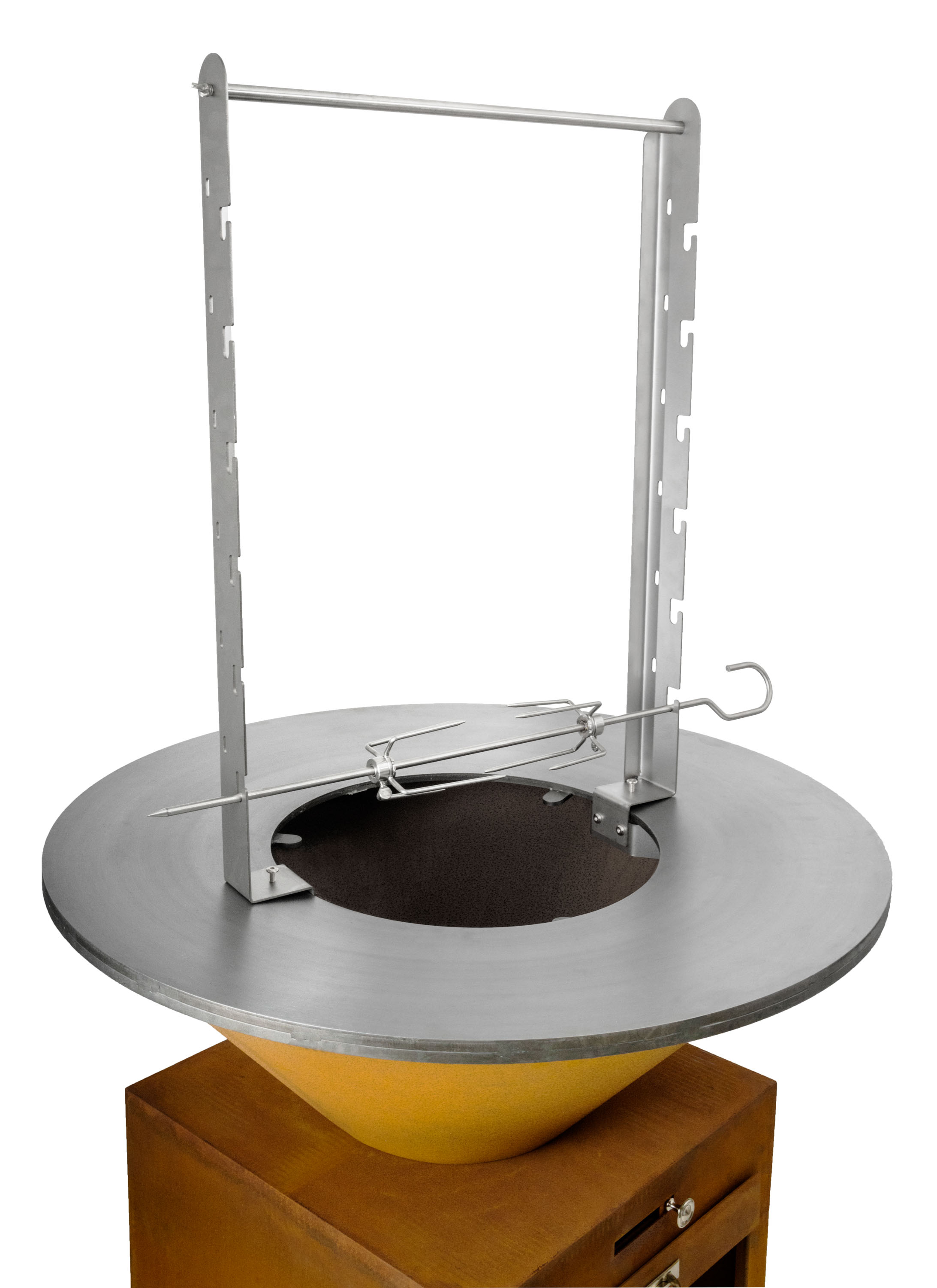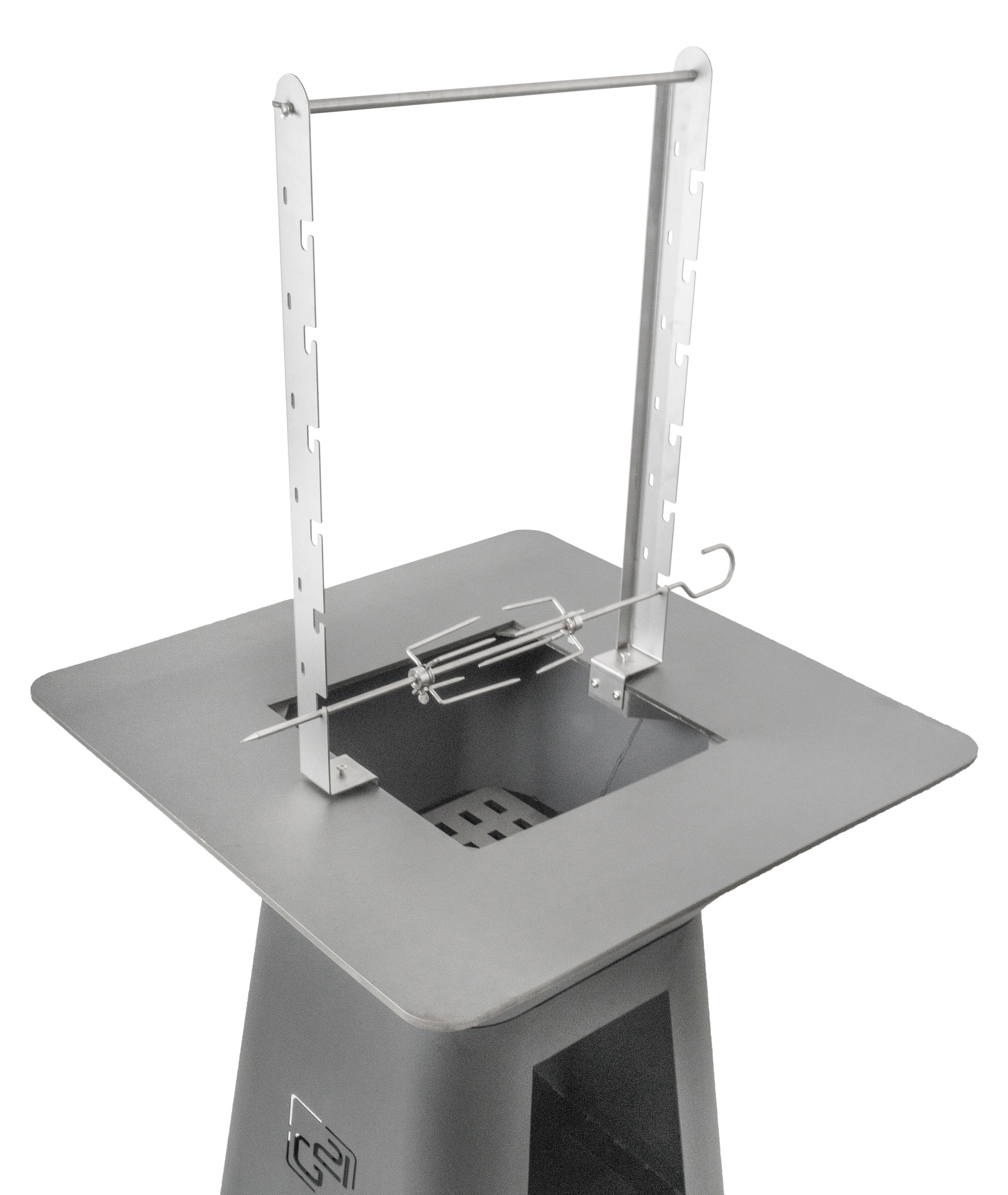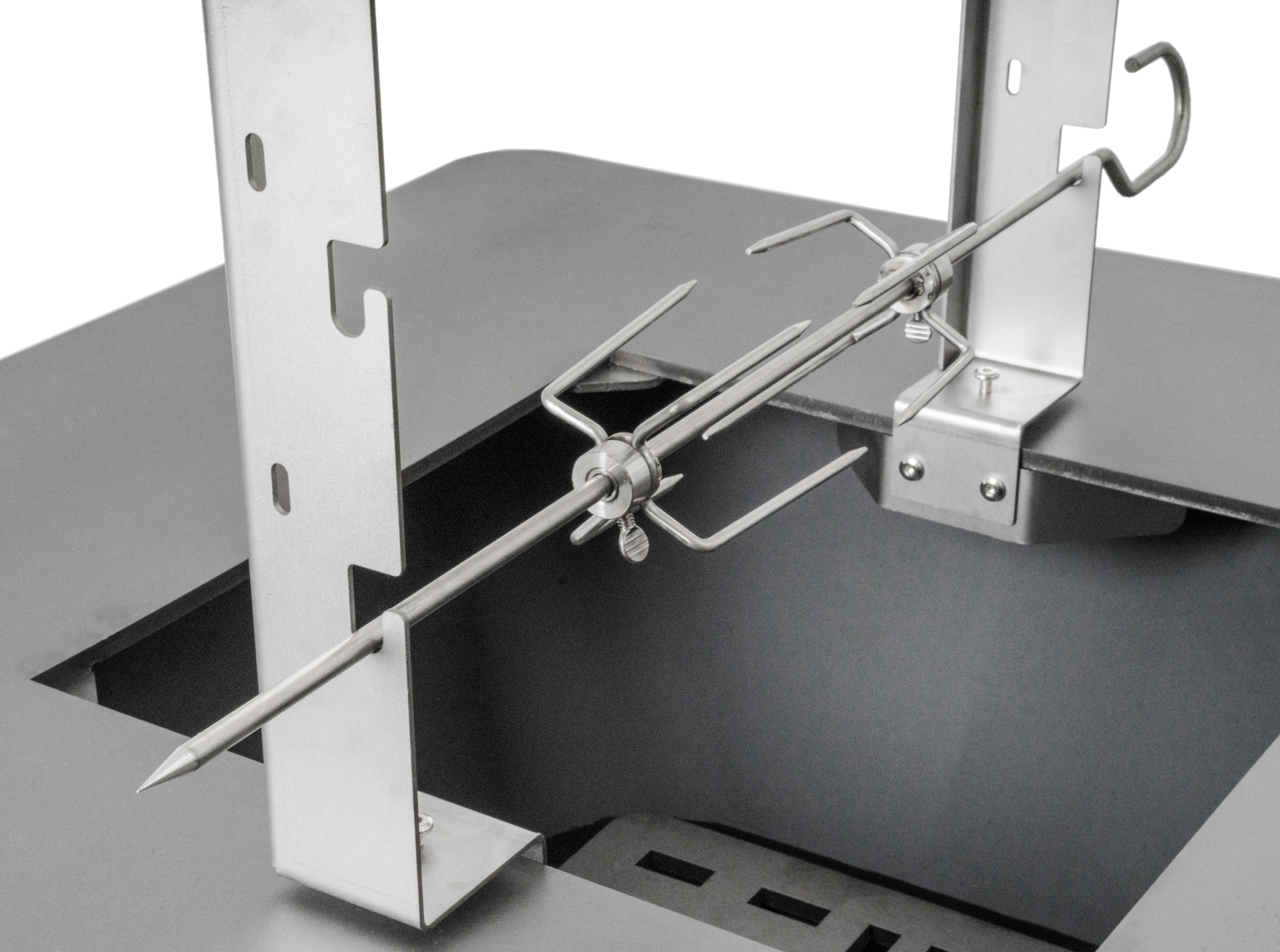 Praktická sestava – grilovací jehla a stojan z kvalitní nerezové oceli se 6 polohami pro umístění grilovací jehly nebo možností zavěšení kotlíku.