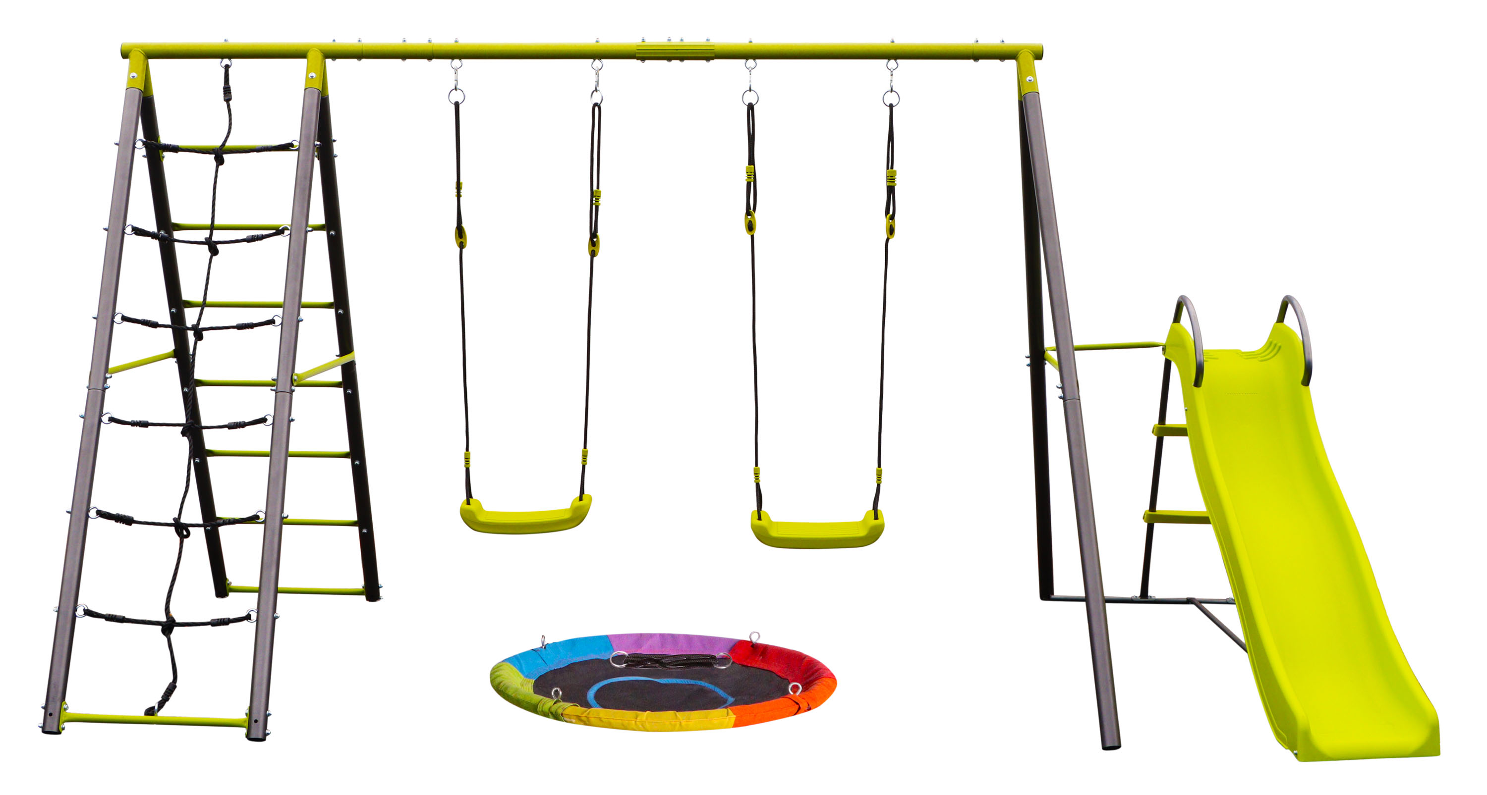 Oblíbená zahradní dětská atrakce – rám, houpací kruh a skluzavka. Odolná a stabilní kovová konstrukce se žebříkem a lezeckou sítí, univerzální využití.