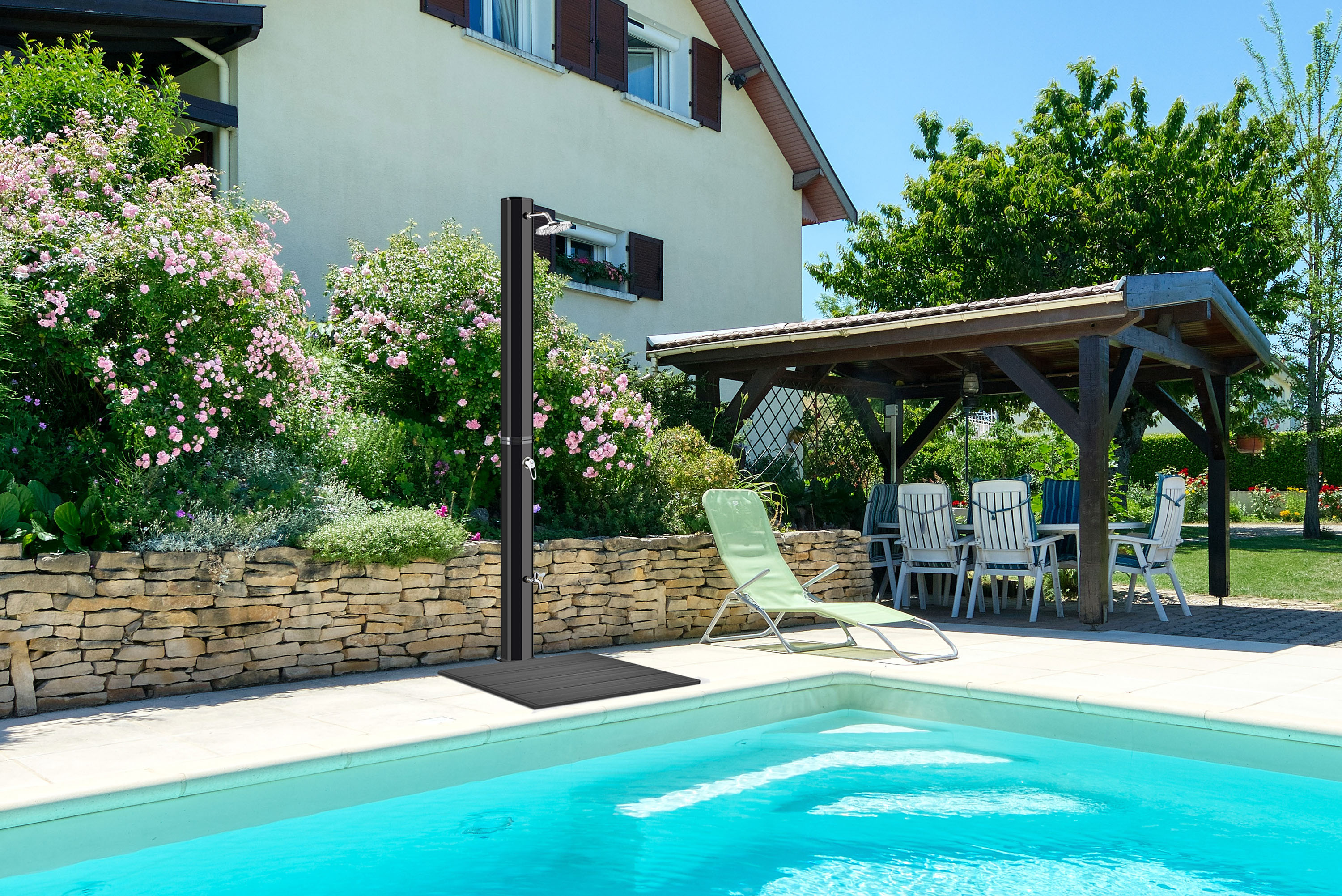 Rošt vytváří pevnou a stabilní základnu pod solární sprchou, díky které voda může volně odtékat mezi lamelami a vy tak nestojíte v kaluži ani v blátě. Sprchování je tak nejen pohodlnější, ale také hygieničtější. Povrch v dekoru dřevěných prken působí přirozeně a elegantně, proto rošt skvěle zapadne do prostředí zahrady, terasy i okolí bazénu. Kvalitní plastový materiál je navíc odolný vůči vlhkosti, slunci i běžnému opotřebení, snadno se udržuje a je vhodný pro dlouhodobé venkovní používání.