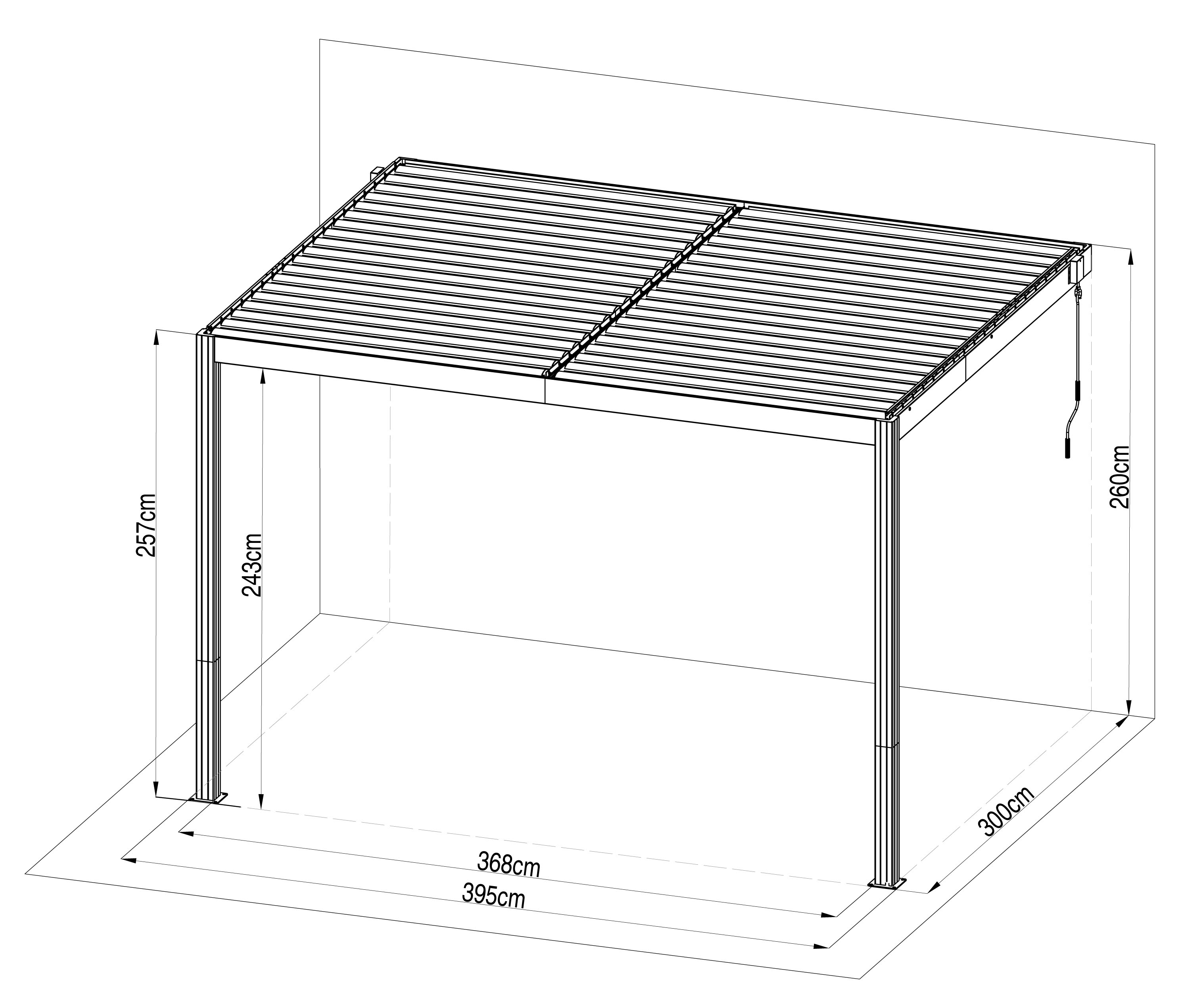 Boční stěna s otočnými pozinkovanými lamelami pro větší soukromí i ochranu před větrem,deštěm či sluncem. Stabilní konstrukce z kvalitního hliníku, snadná instalace.