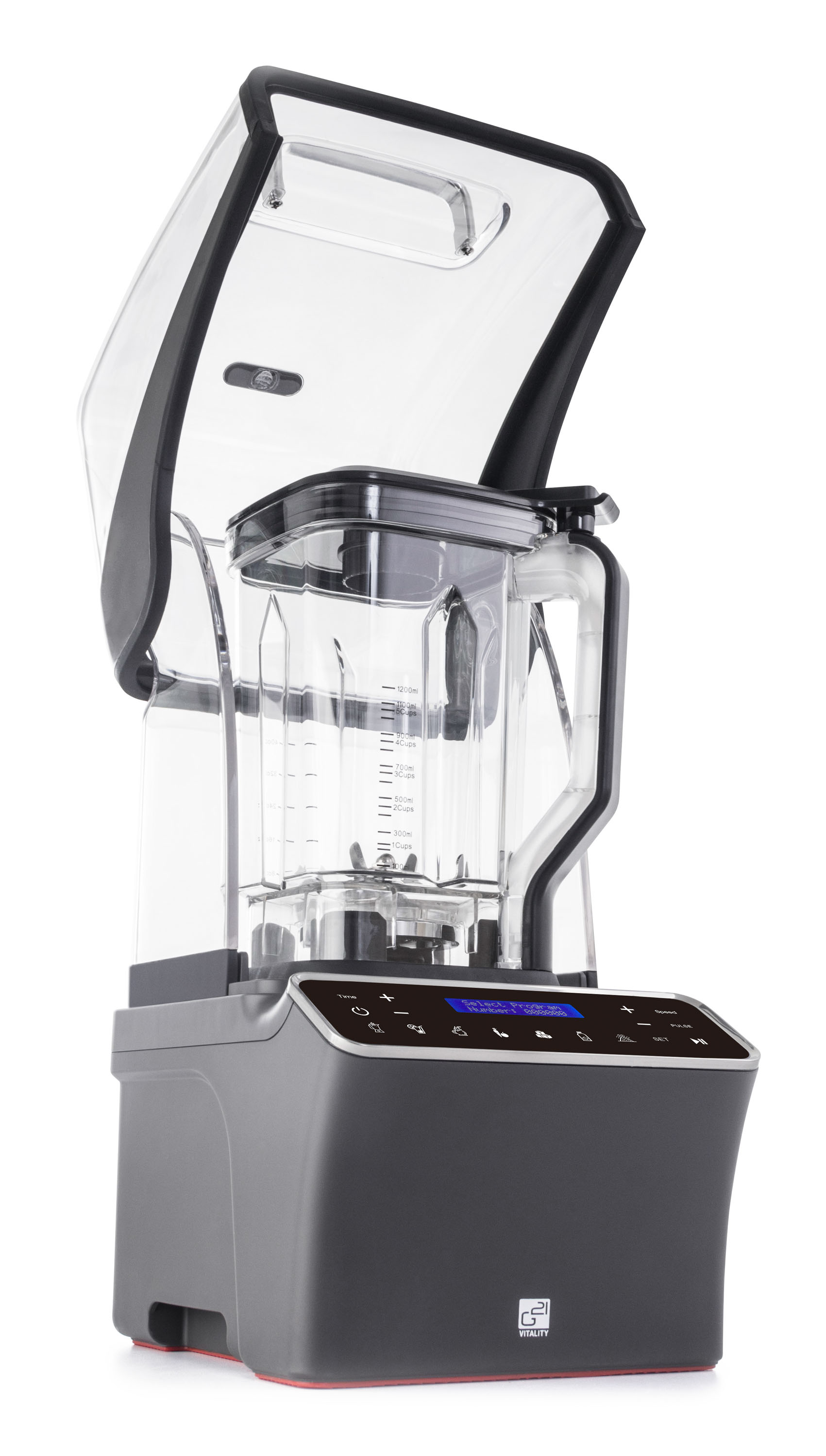 Velkou předností tohoto stolního mixéru v atraktivním moderním designu je odhlučňovací kryt pro izolaci hluku. Provoz blenderu G21 Ultimate je proto podstatně tišší, než je tomu u jiných stolních mixérů. Odhlučňovací kryt je průhledný, takže nebrání ve výhledu na obsah mixovací nádoby. Zároveň kryt slouží jako bezpečnostní pojistka – mixér se spustí pouze tehdy, když je kryt správně zavřený.