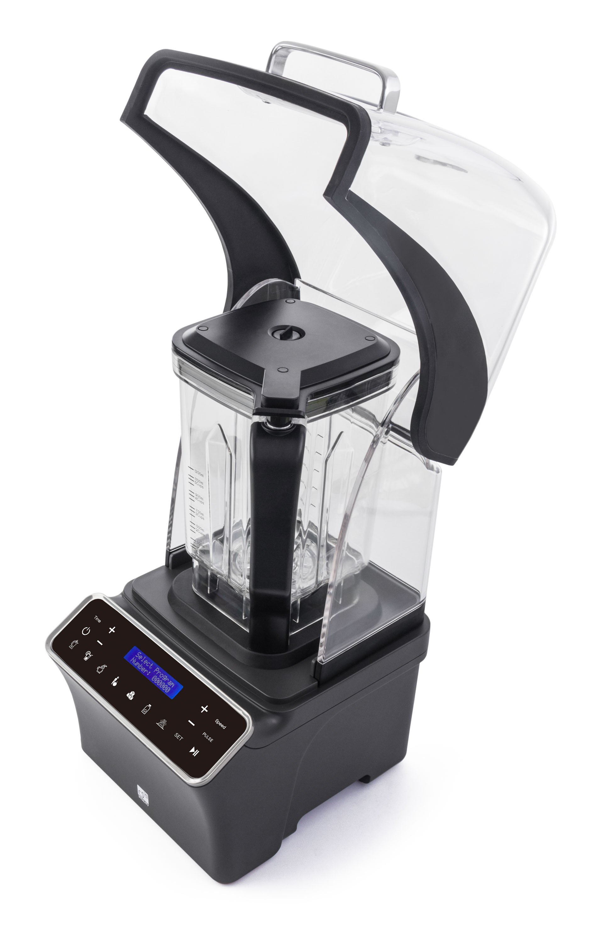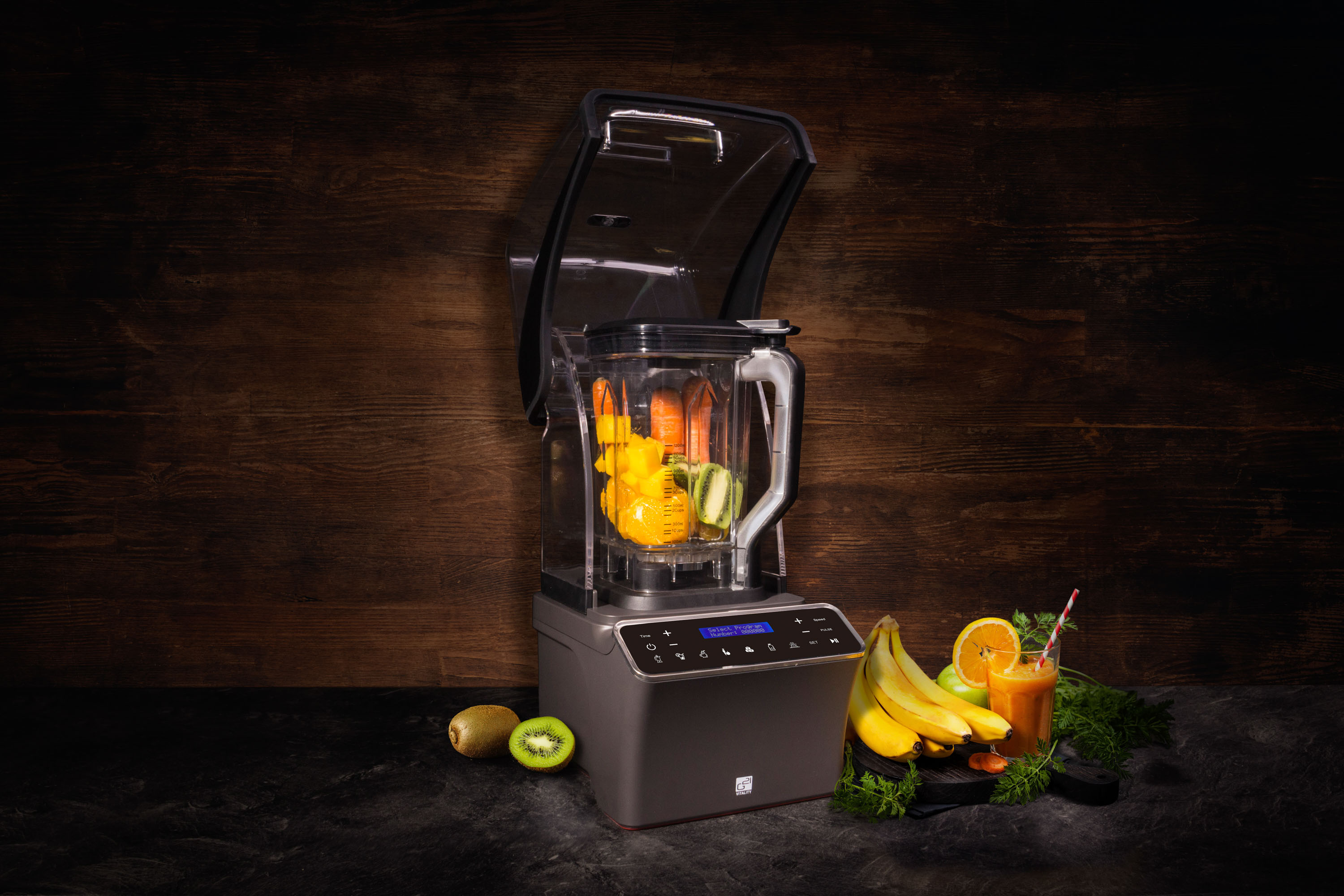 Po uzavření mixovací nádoby se surovinami sklopíte odhlučňovací kryt, jedním dotykem spustíte vakuování a poté můžete mixovat.