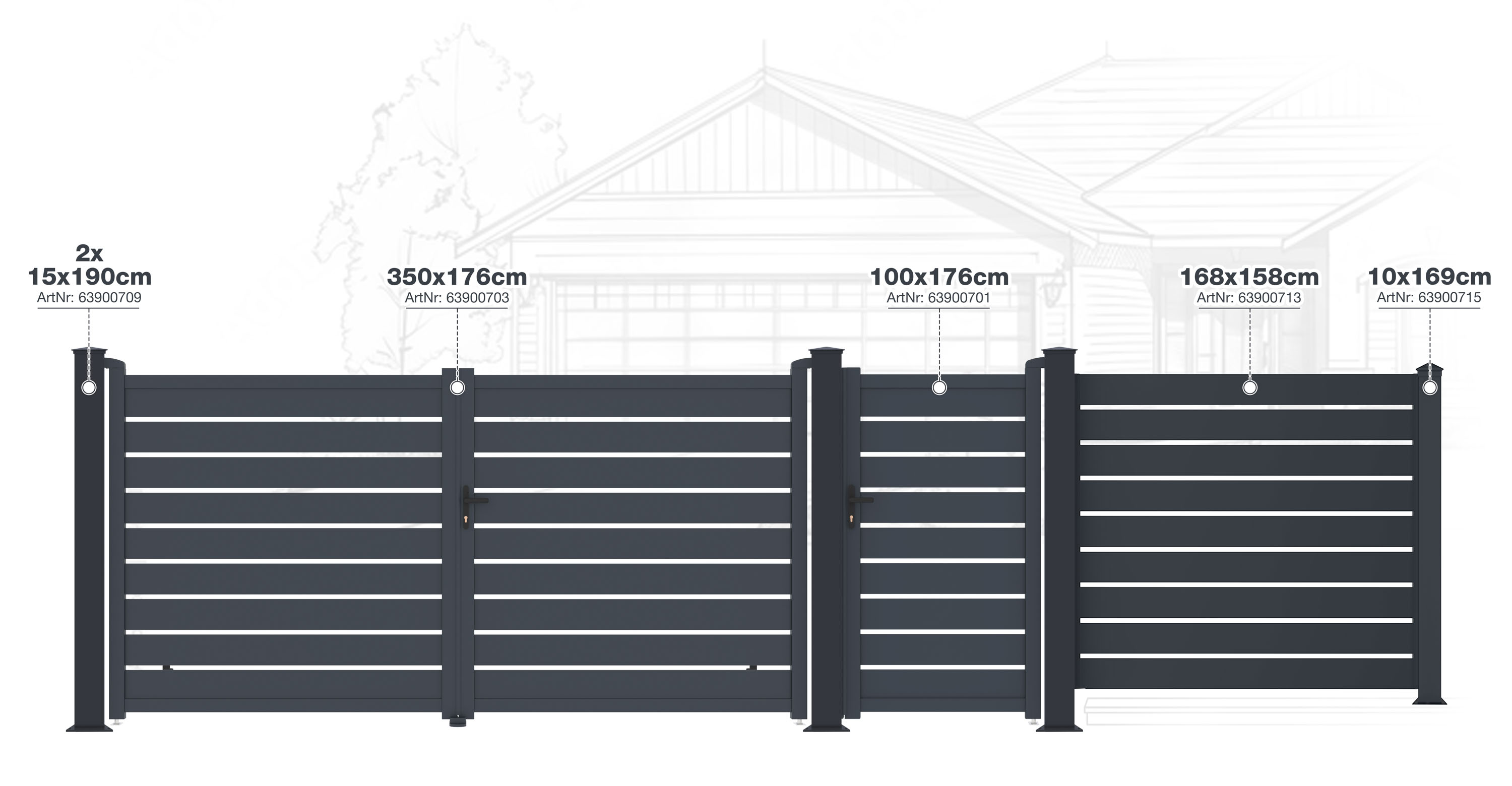 Plotové pole o šířce 168 cm je vysoké 69 cm, materiál hliník s ochranným protikorozním práškovým nástřikem. Čistý atraktivní design, bezúdržbovost, možnost přizpůsobení šířky na míru.