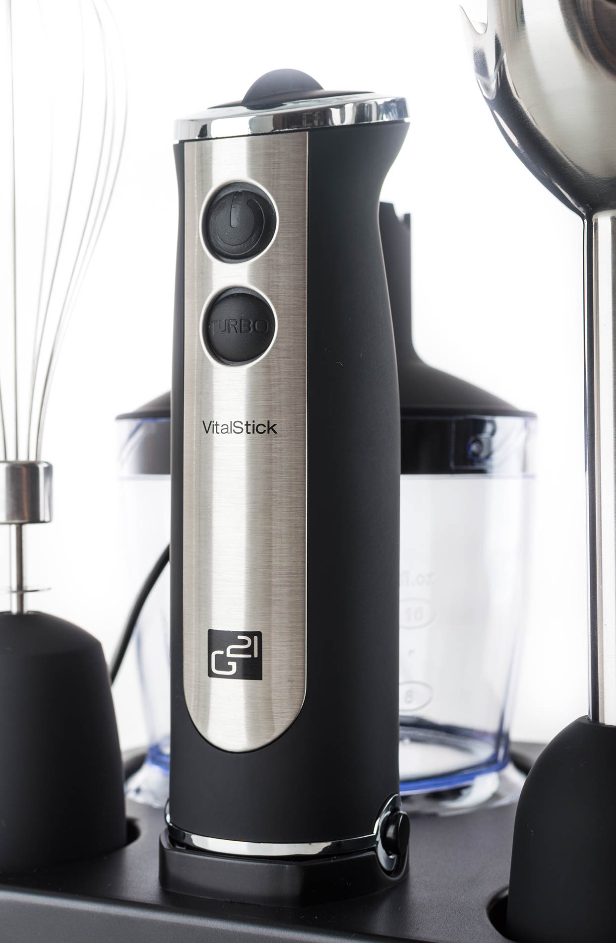 Multifunkční tyčový mixér G21 VitalStick Pro v černé barvě s výkonem 1000 W. Rozložení nožů 3D Quattro blade systém pro mixování ve 4 úrovních. Mixovací nástavec, šlehací metla, nástavec na pyré, nádoba na sekání, nádoba na šlehání, stojan.