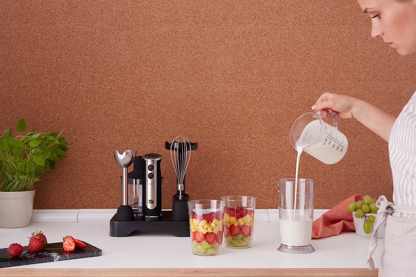 Ano, příslušenství, kterým jsme tyčový mixér VitalStick vybavili, je skutečně bohaté. Základní tyčový nástavec můžete nahradit nerezovou metličkou na sníh nebo nástavcem na přípravu hebkého, hladkého pyré. O stojanu jsme se už zmínili, o nádobách ne, že? K VitalSticku jsou hned dvě. Kvalitní, transparentní s měrnou stupnicí. A spolu s ostatním příslušenstvím je samozřejmě můžete mýt i v myčce.