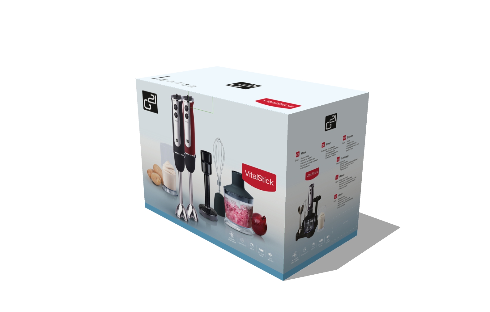 Multifunkční tyčový mixér G21 VitalStick v červeno - černé barvě s výkonem 800 W. Rozložení nožů 3D Quattro blade systém pro mixování ve 4 úrovních. Mixovací nástavec, šlehací metla, nástavec na pyré, nádoba na sekání, nádoba na šlehání, stojan.