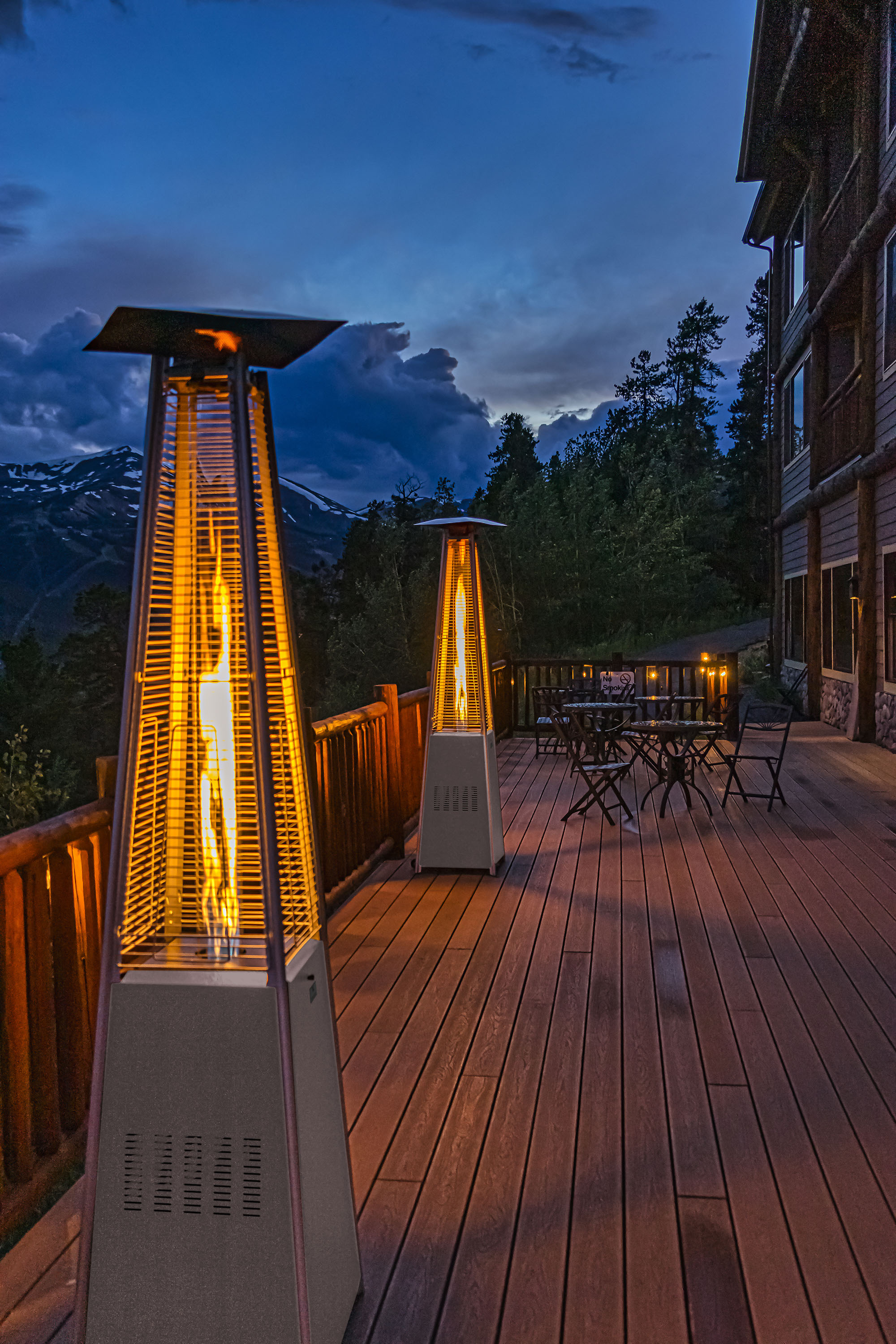 Tepelný zářič G21 Volcano na terase hotelu v horách.