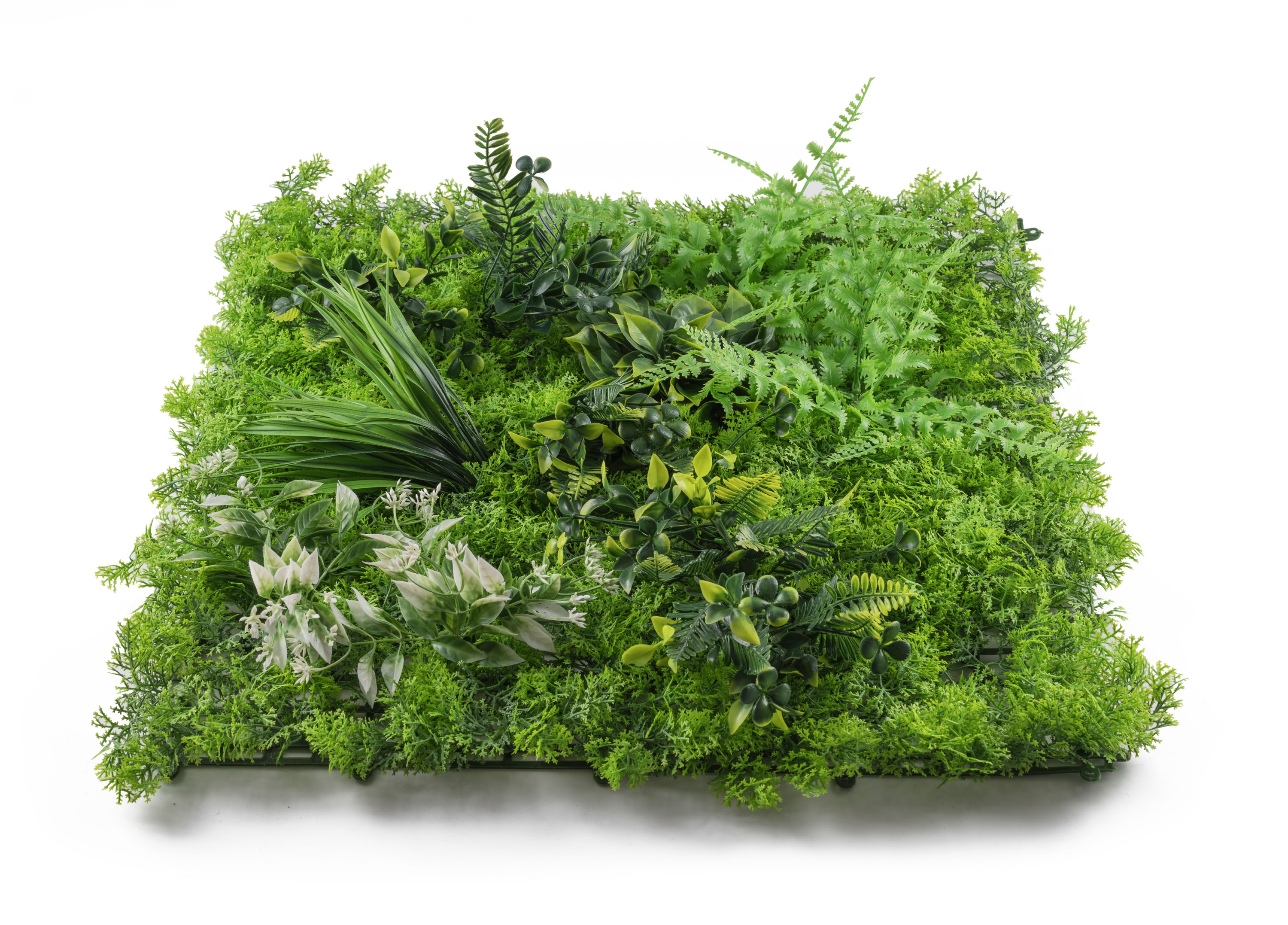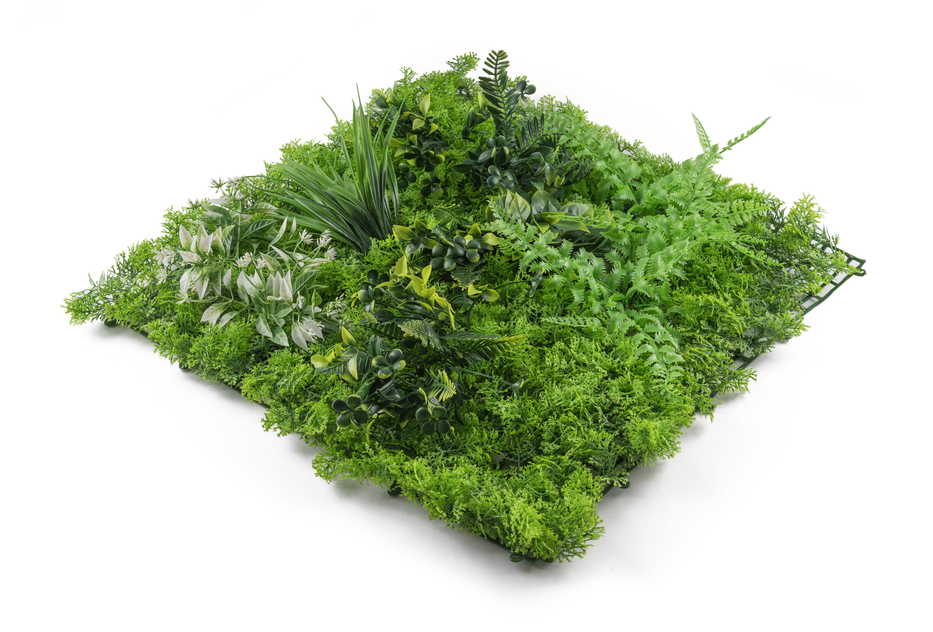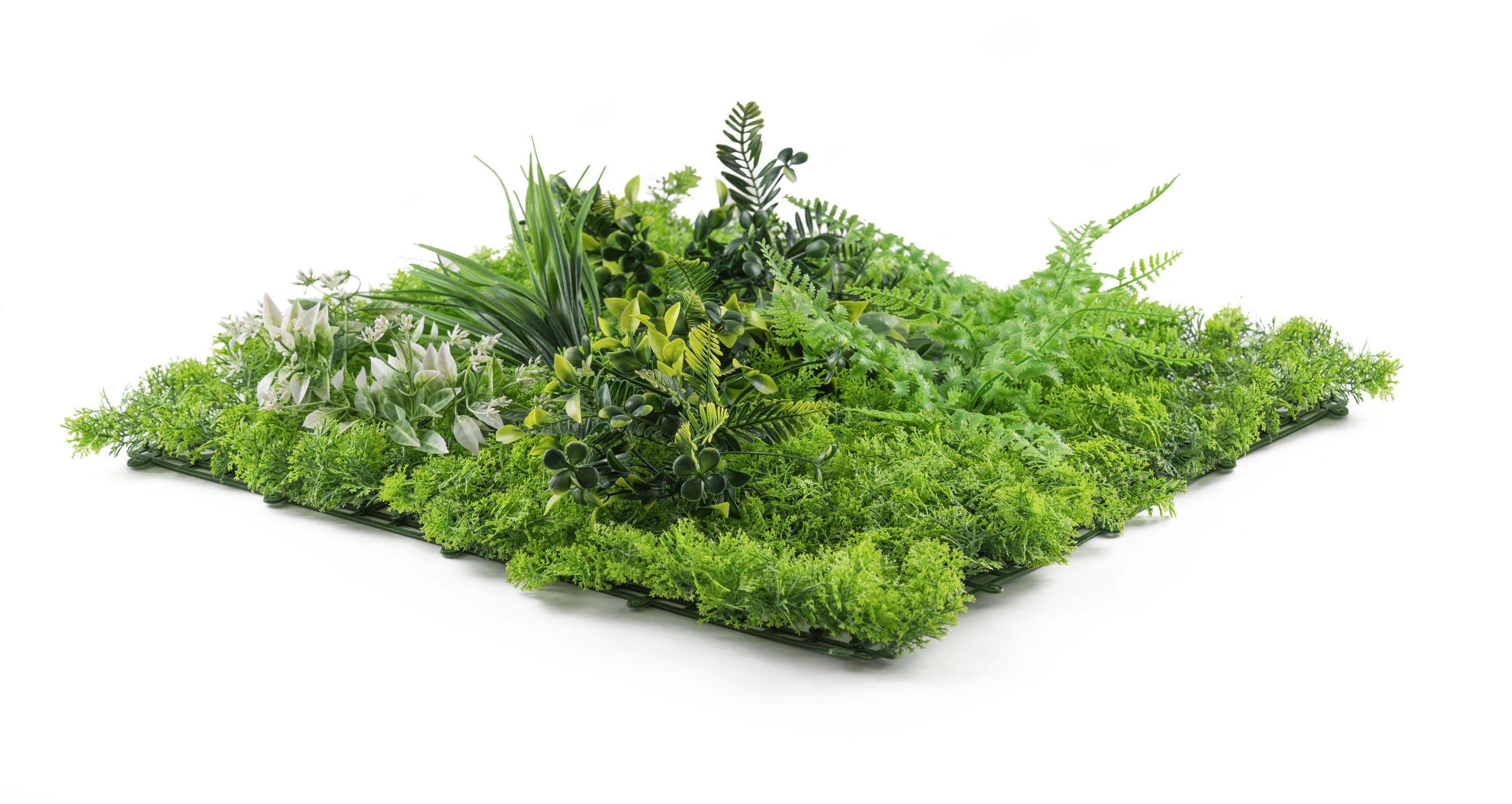 Umělá zelená stěna G21 přináší luxusní 3D efekt a realistický vzhled živé zeleně s nulovými nároky na údržbu. Rozměr panelu je 50x50 cm, panely lze libovolně kombinovat. UV ochrana zajistí,že je lze použít v interiéru i exteriéru.
