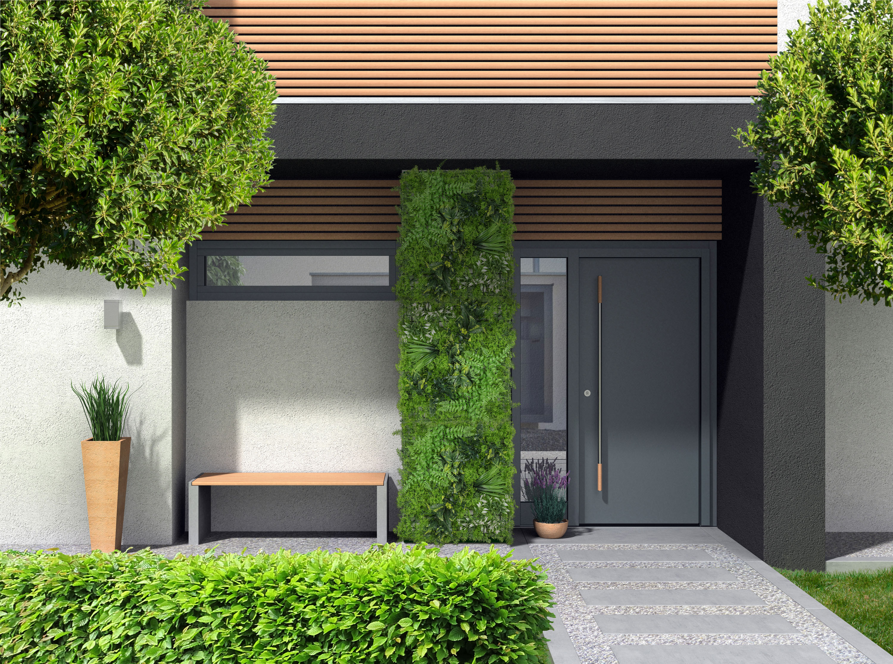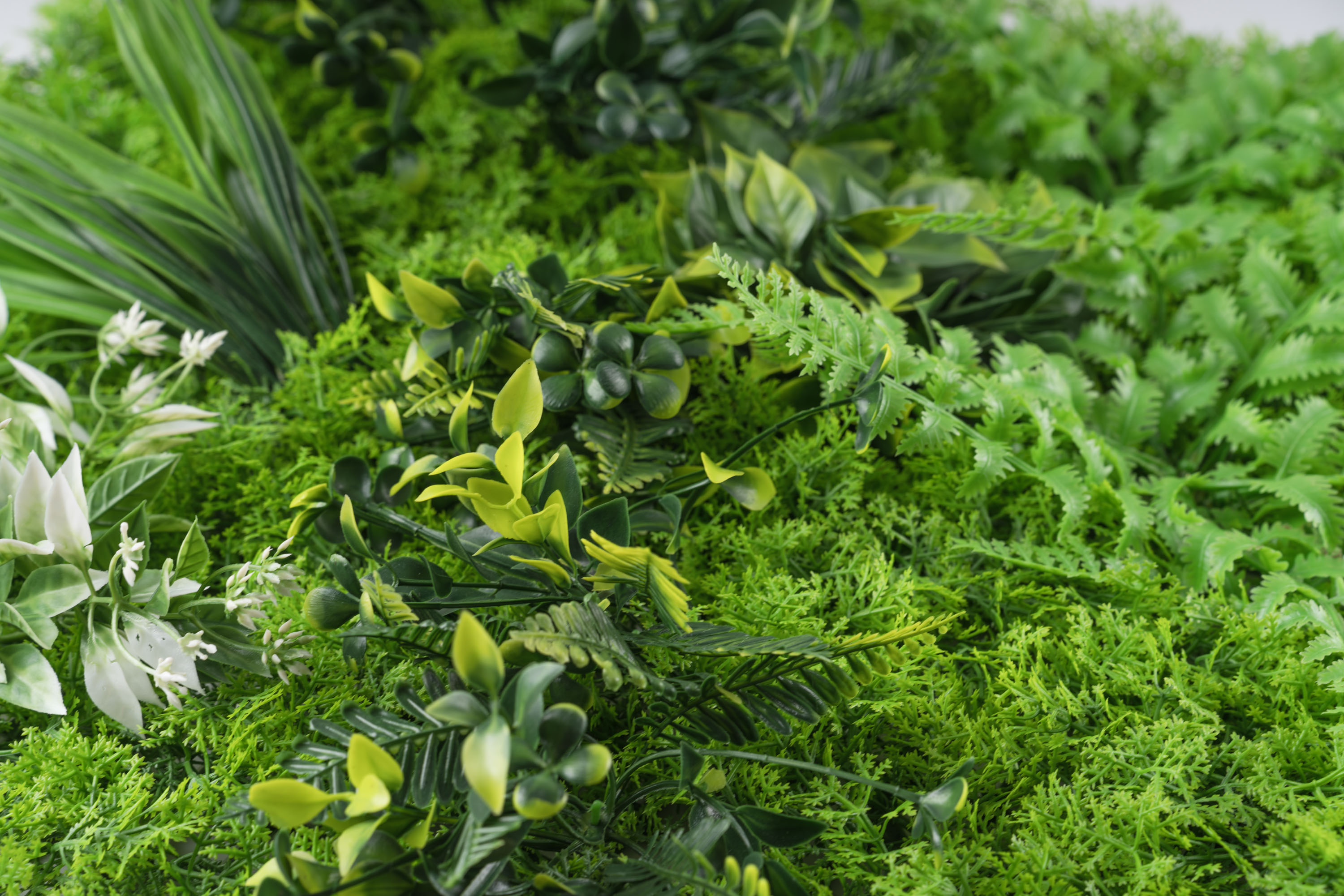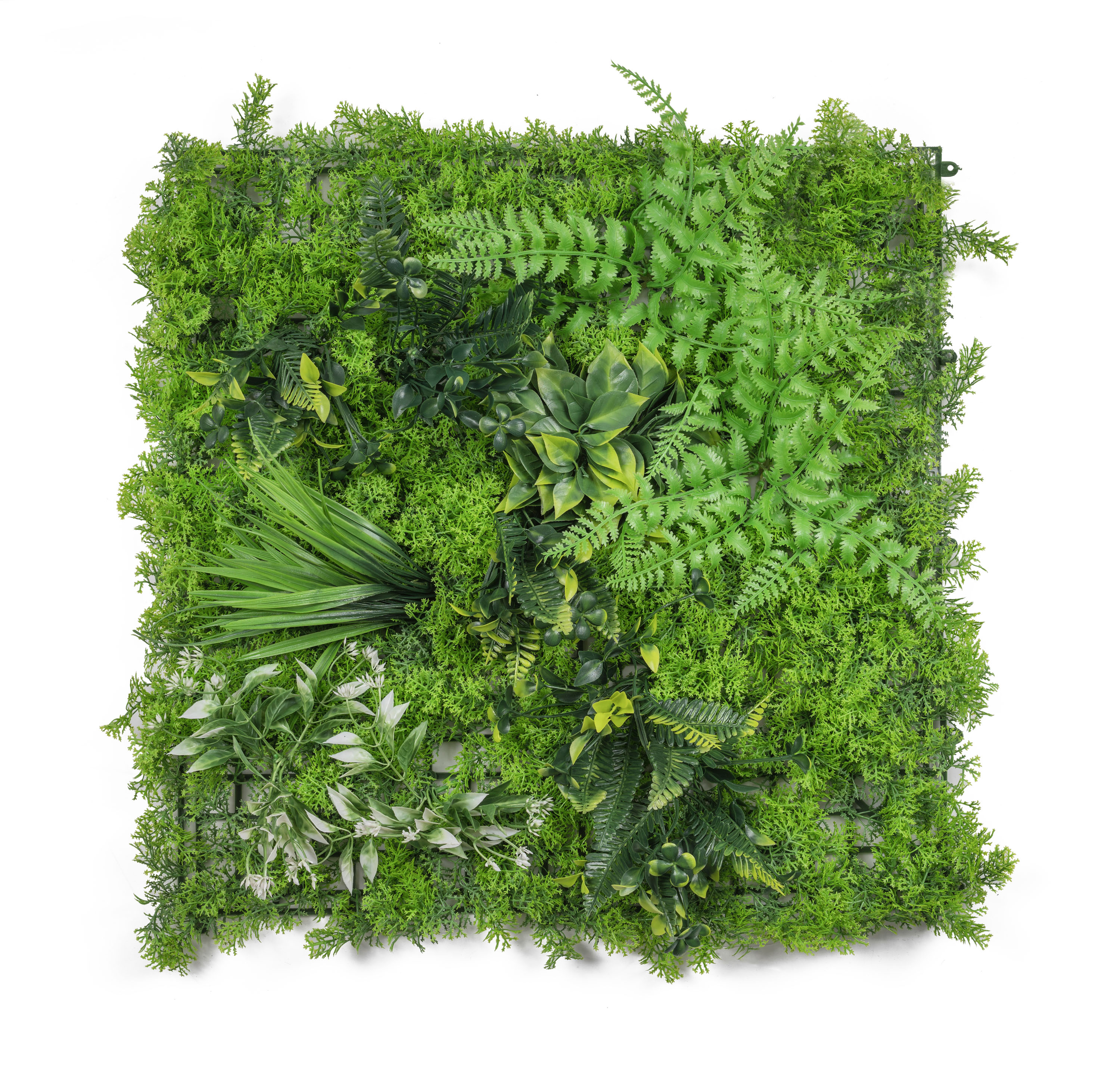 Umělá zelená stěna G21 přináší luxusní 3D efekt a realistický vzhled živé zeleně s nulovými nároky na údržbu. Rozměr panelu je 50x50 cm, panely lze libovolně kombinovat. UV ochrana zajistí,že je lze použít v interiéru i exteriéru.