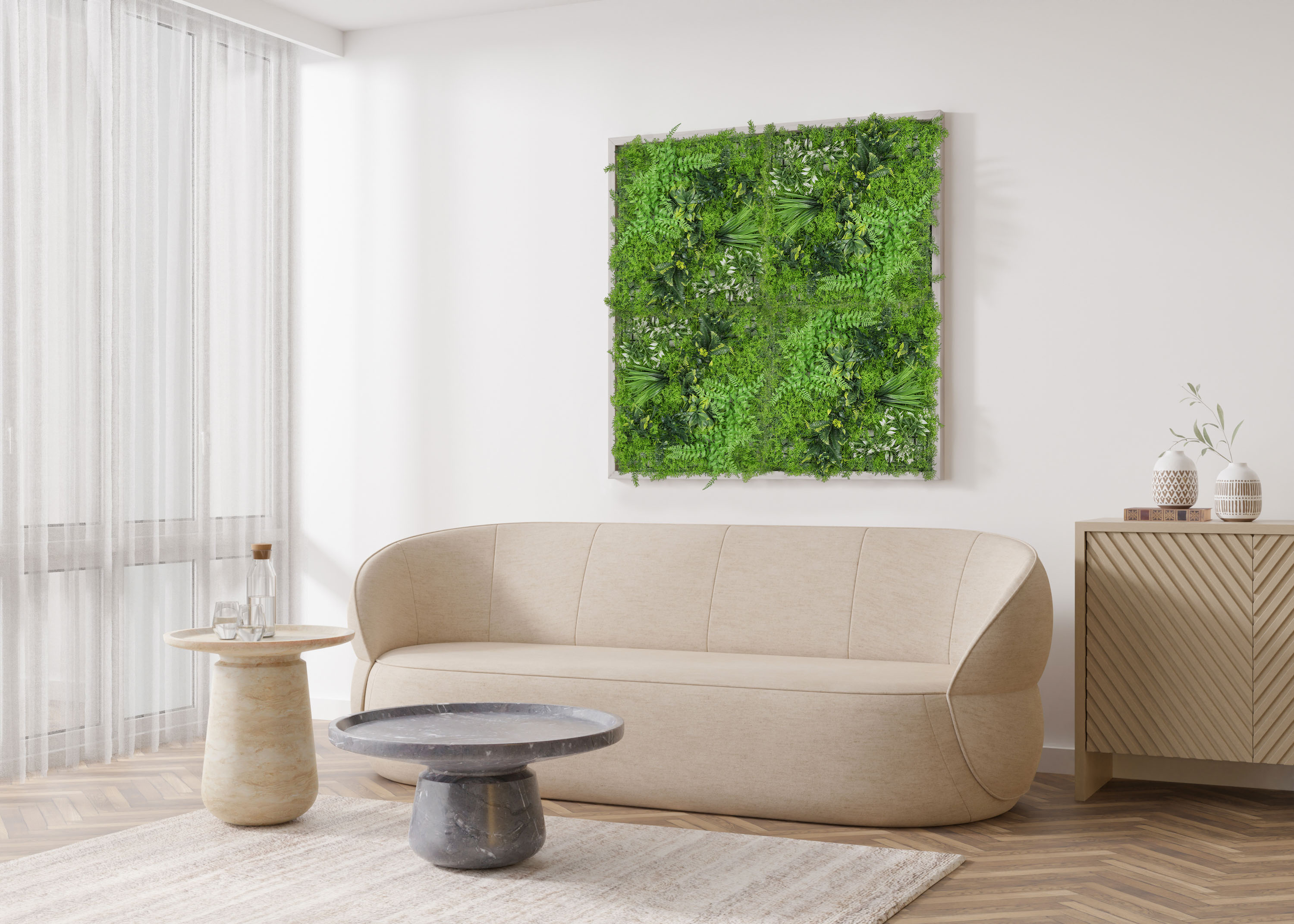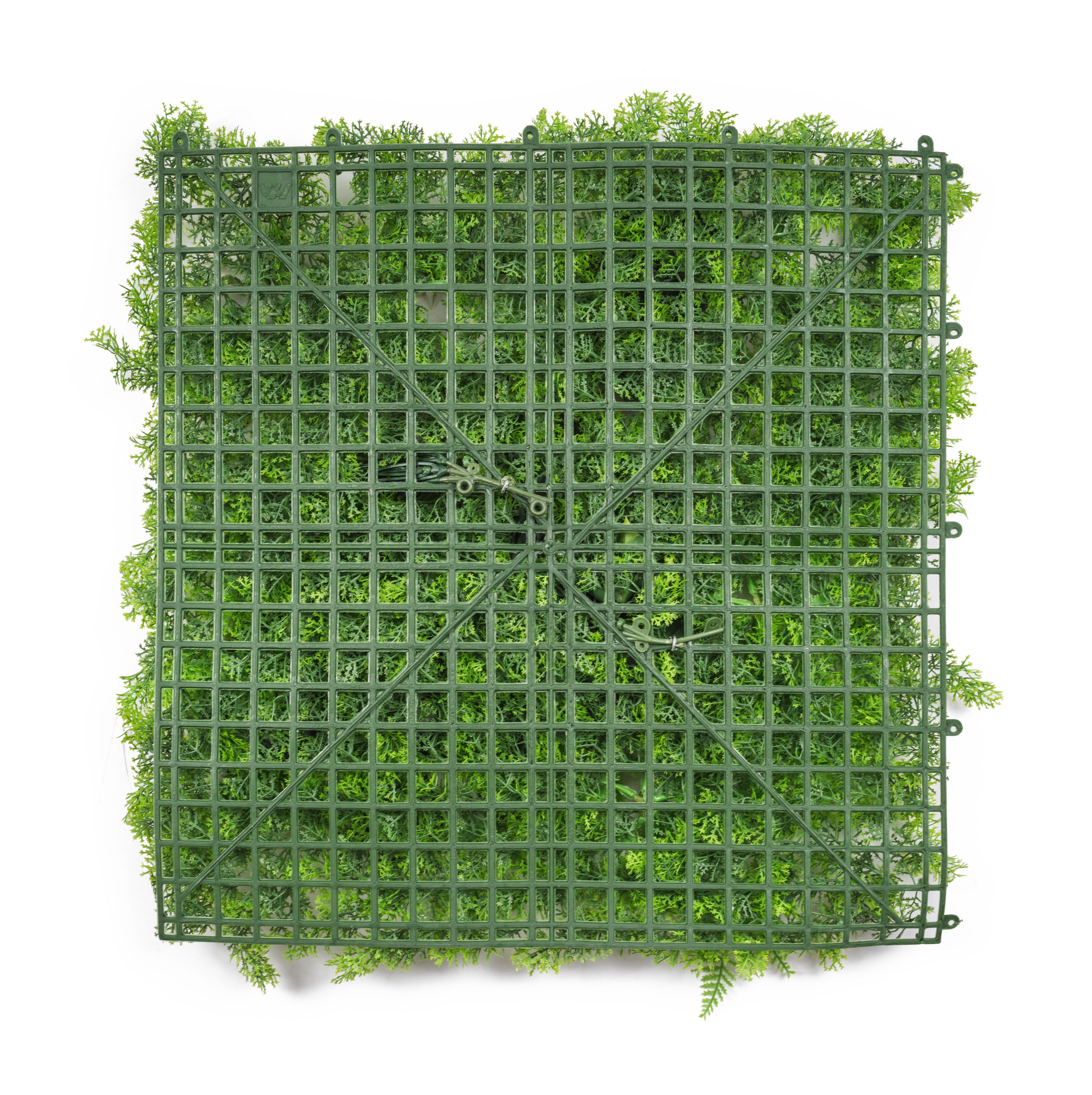 Jeden panel, spousta možností. Použijte jej jako zajímavý interiérový doplněk, vytvořte zelenou stěnu v obýváku, přírodní zákoutí na balkoně, nebo zakryjte starý plot. Panely o rozměrech 50 x 50 cm snadno zkombinujete do větších celků díky modulovému systému rastrů a příchytek na zadní straně každého panelu. Zvládnete to bez vrtání a nářadí, stačí zip páska nebo obyčejné háčky. Ať už panely připevníte na betonovou zeď, dřevěné obložení nebo sádrokarton, výsledek bude vždy perfektní. A co když potřebujete menší rozměr? Pak panel jednoduše zastřihnete a natvarujete podle potřeby.