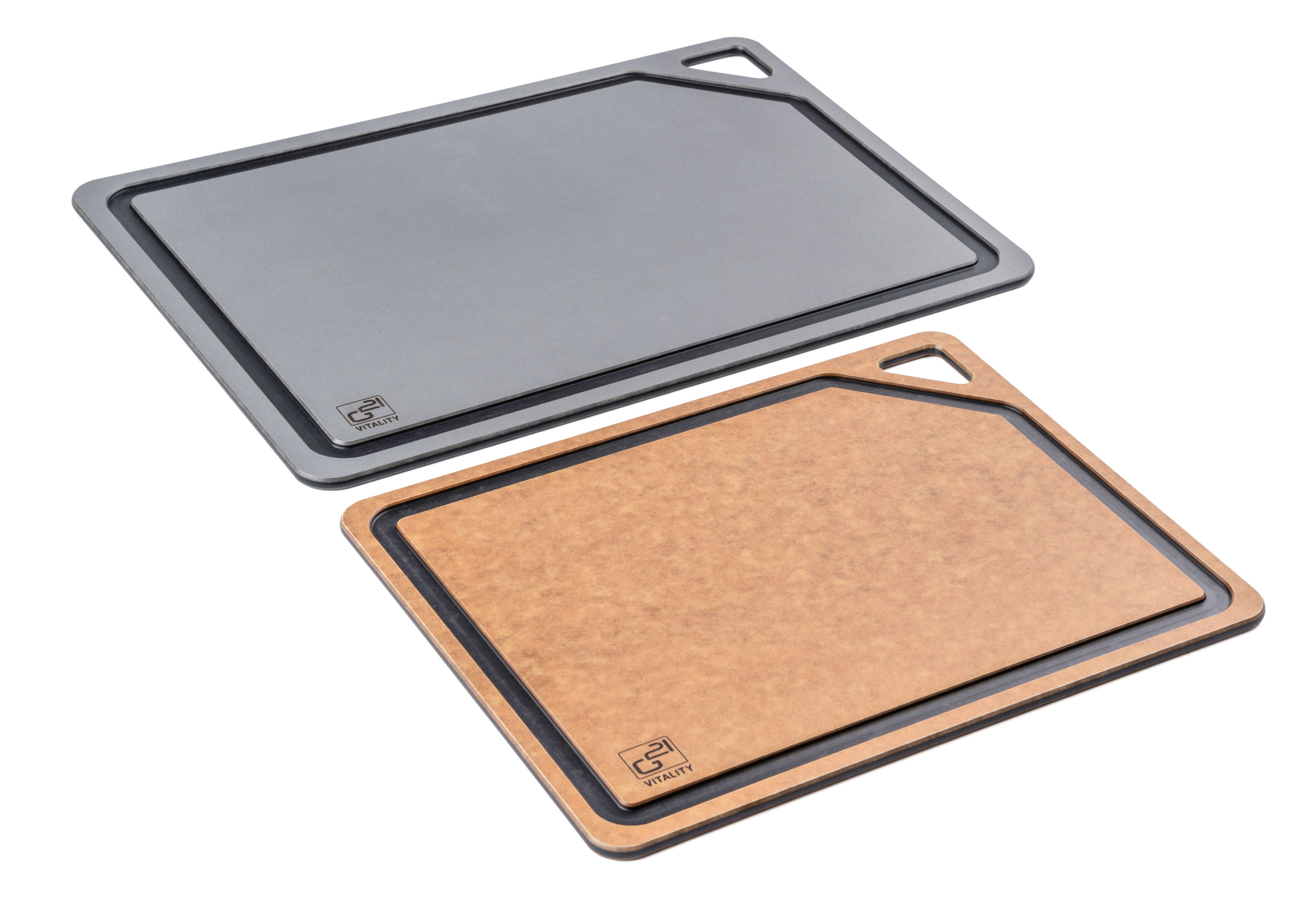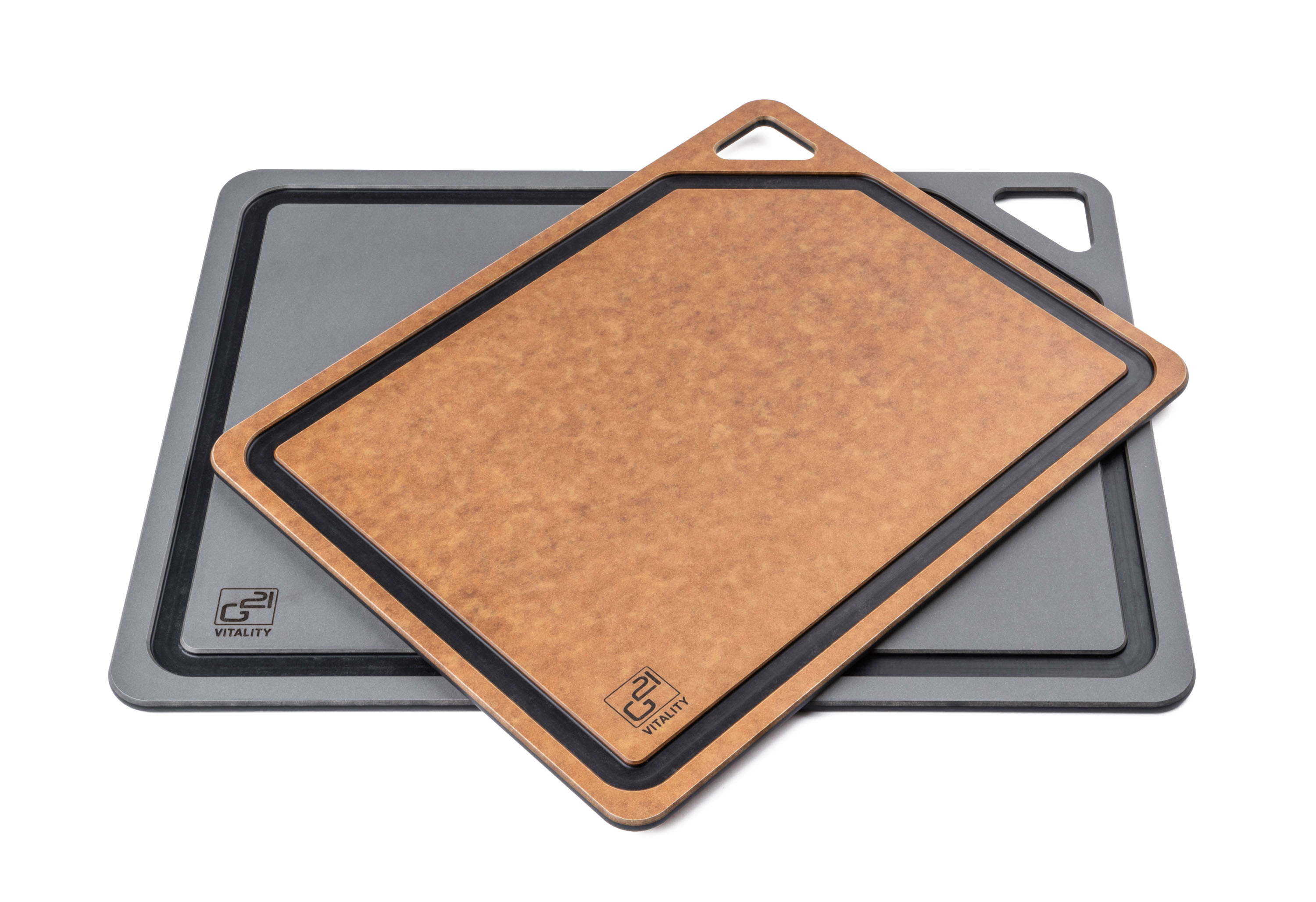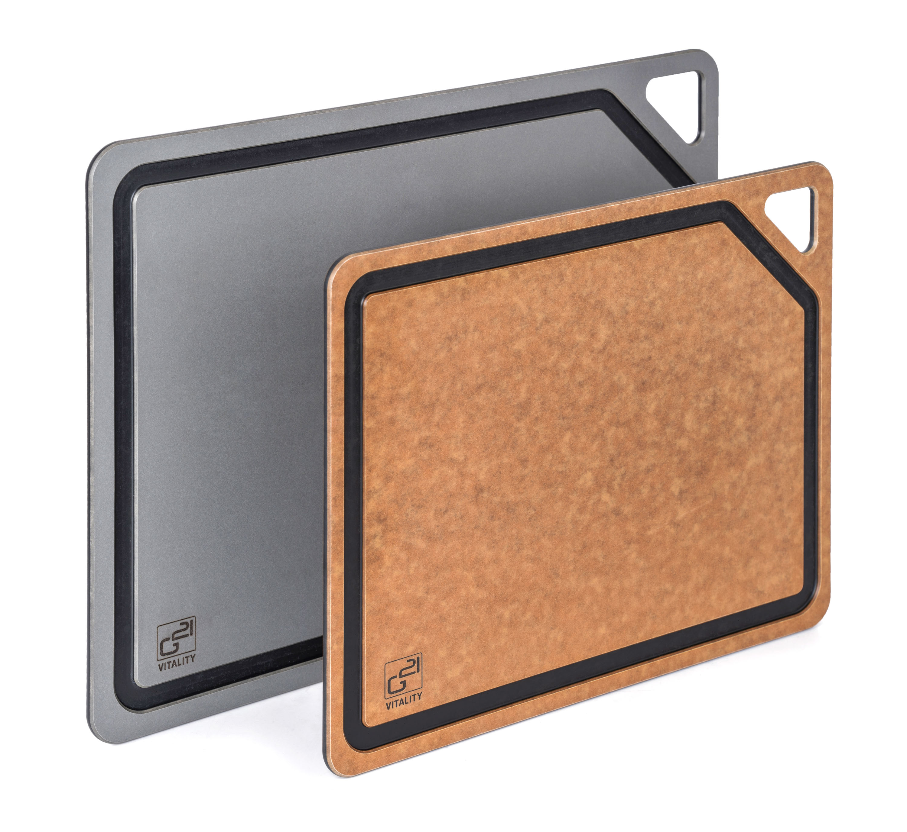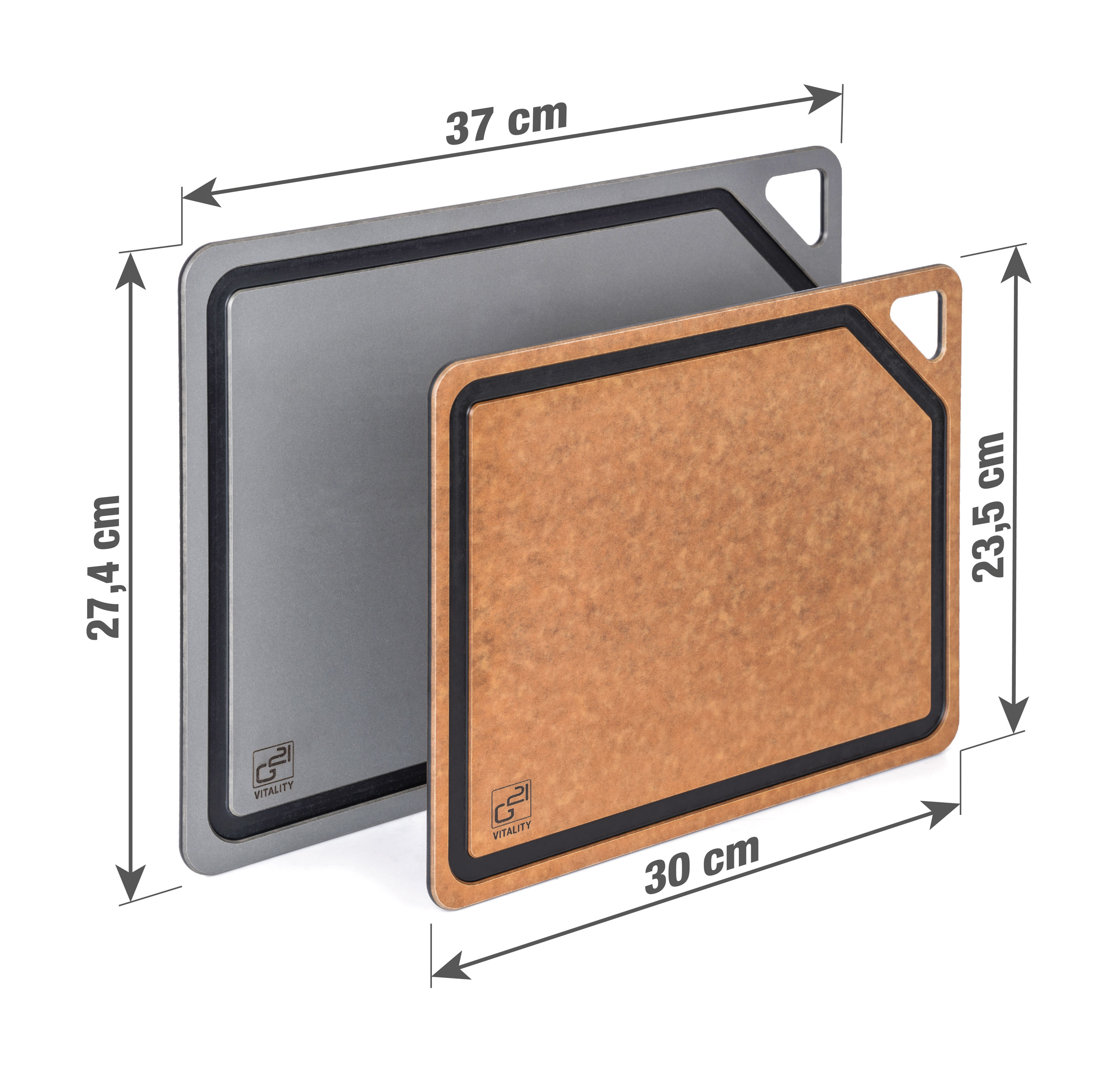 Krájecí prkénka G21 EcoCut z přírodní celulózy, sada 2 ks (30 × 23,5 cm a 37 × 27,4 cm), protiskluzová úprava. Hygienická, neporézní a odolná prkénka jsou šetrná k nožům, vhodná i do myčky.