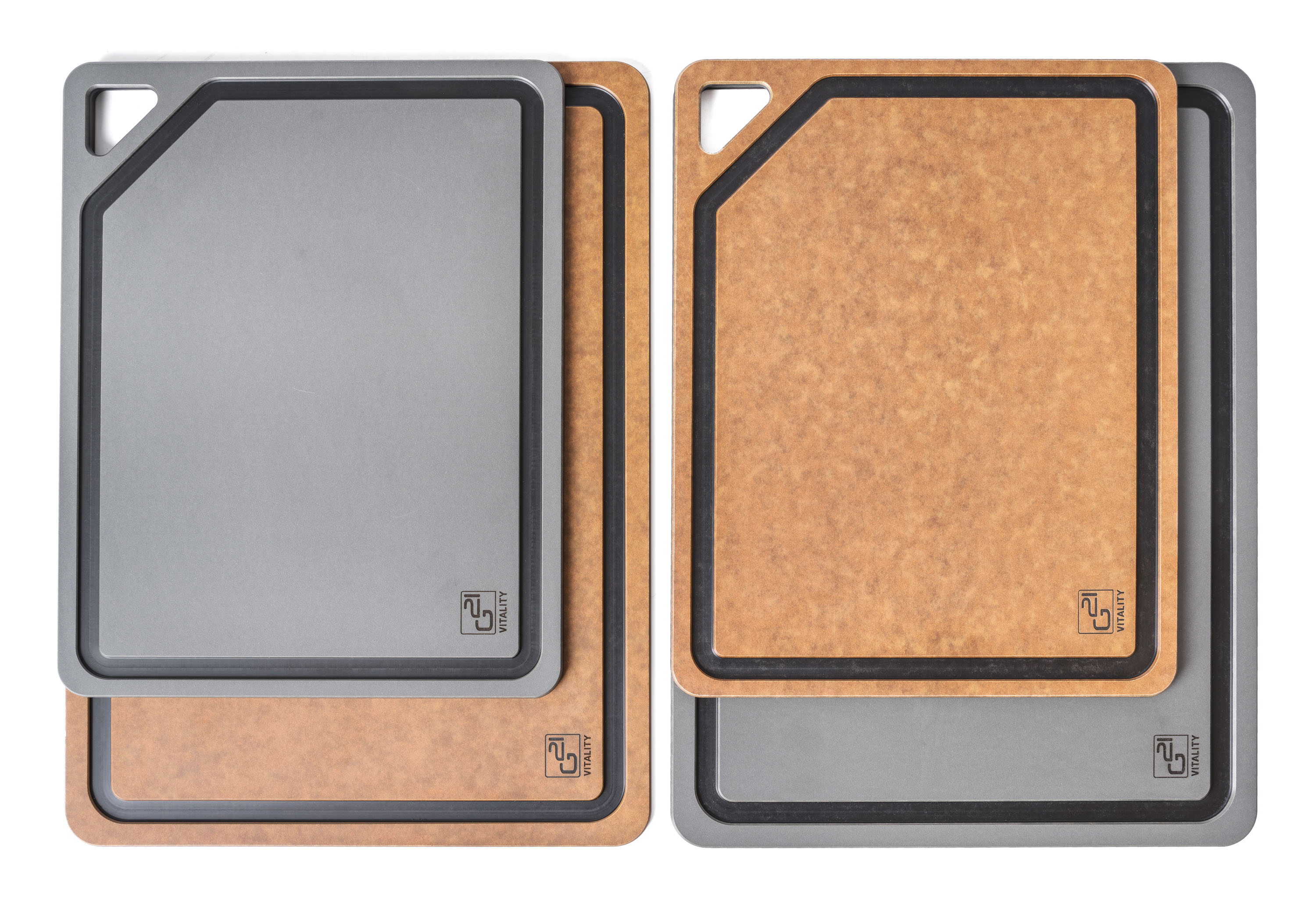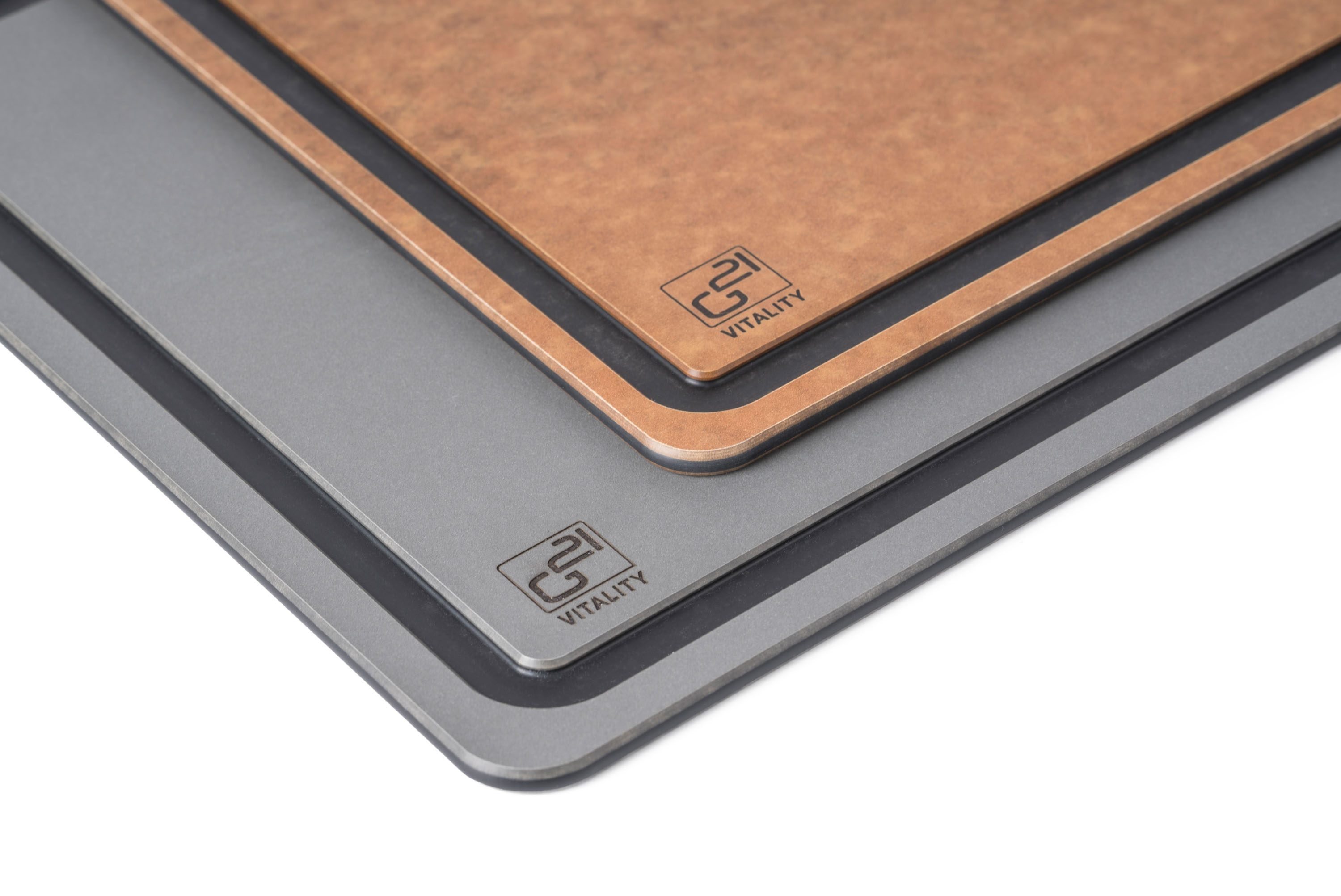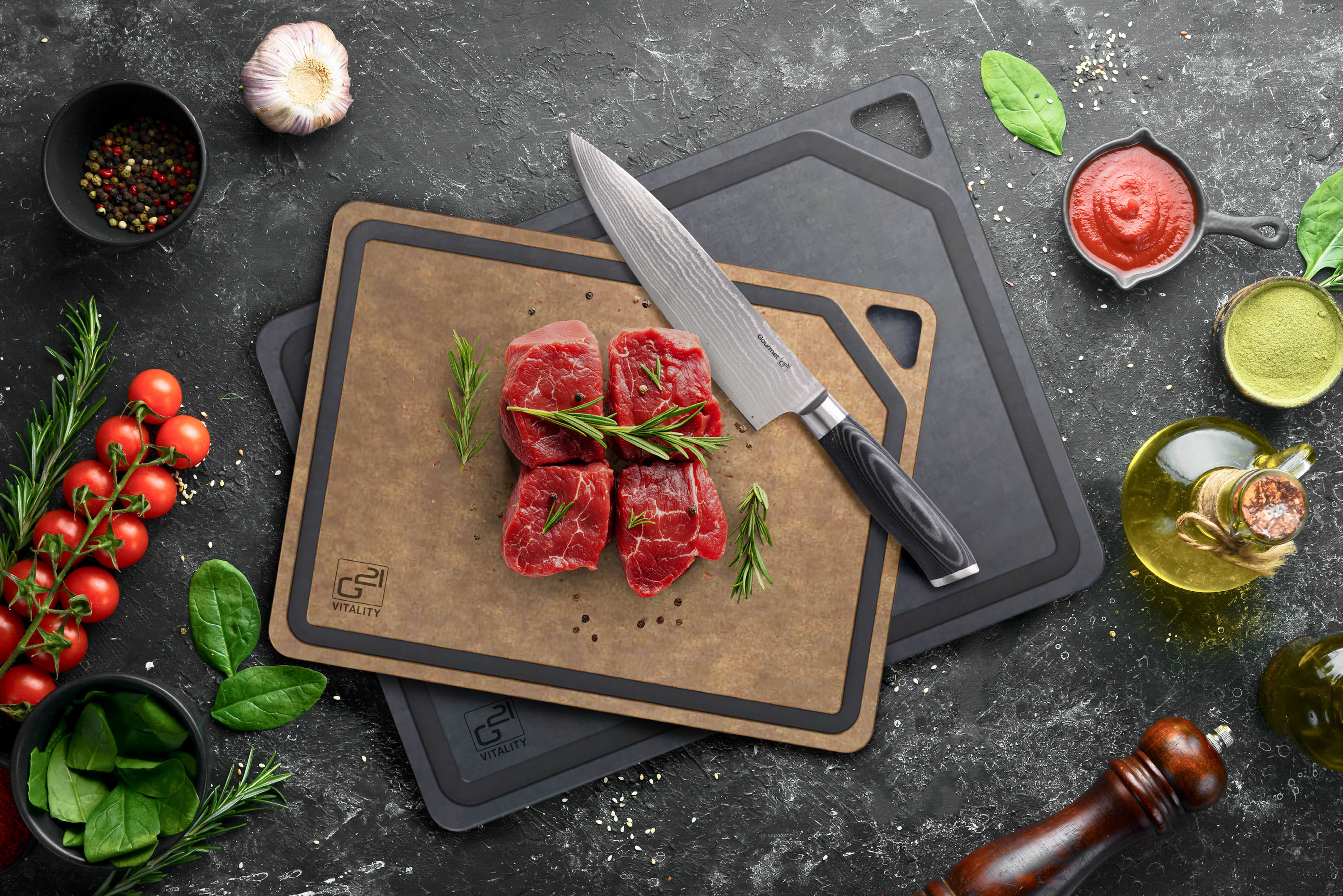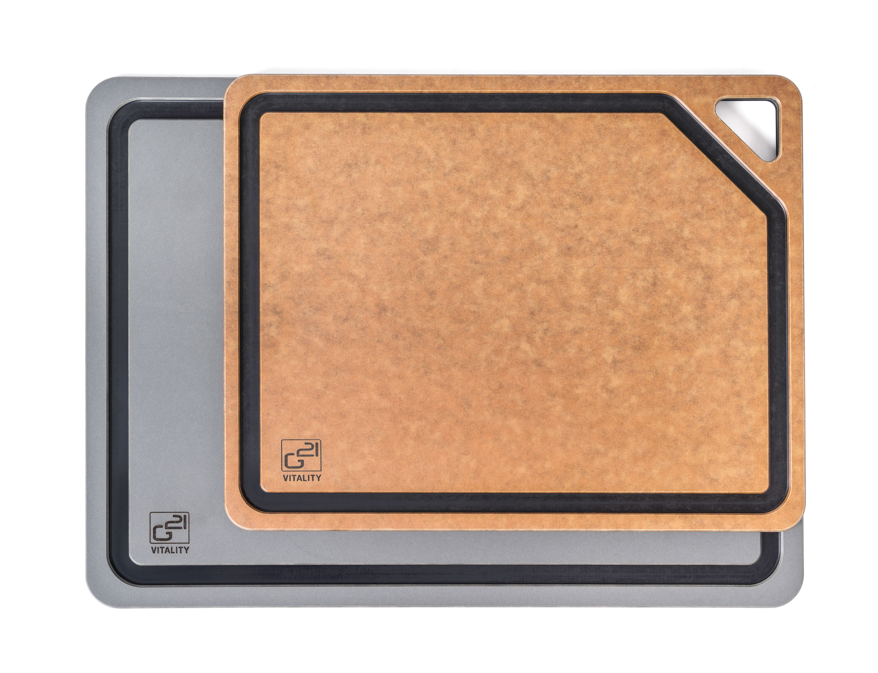Krájecí prkénka G21 EcoCut z přírodní celulózy, sada 2 ks (30 × 23,5 cm a 37 × 27,4 cm), protiskluzová úprava. Hygienická, neporézní a odolná prkénka jsou šetrná k nožům, vhodná i do myčky.