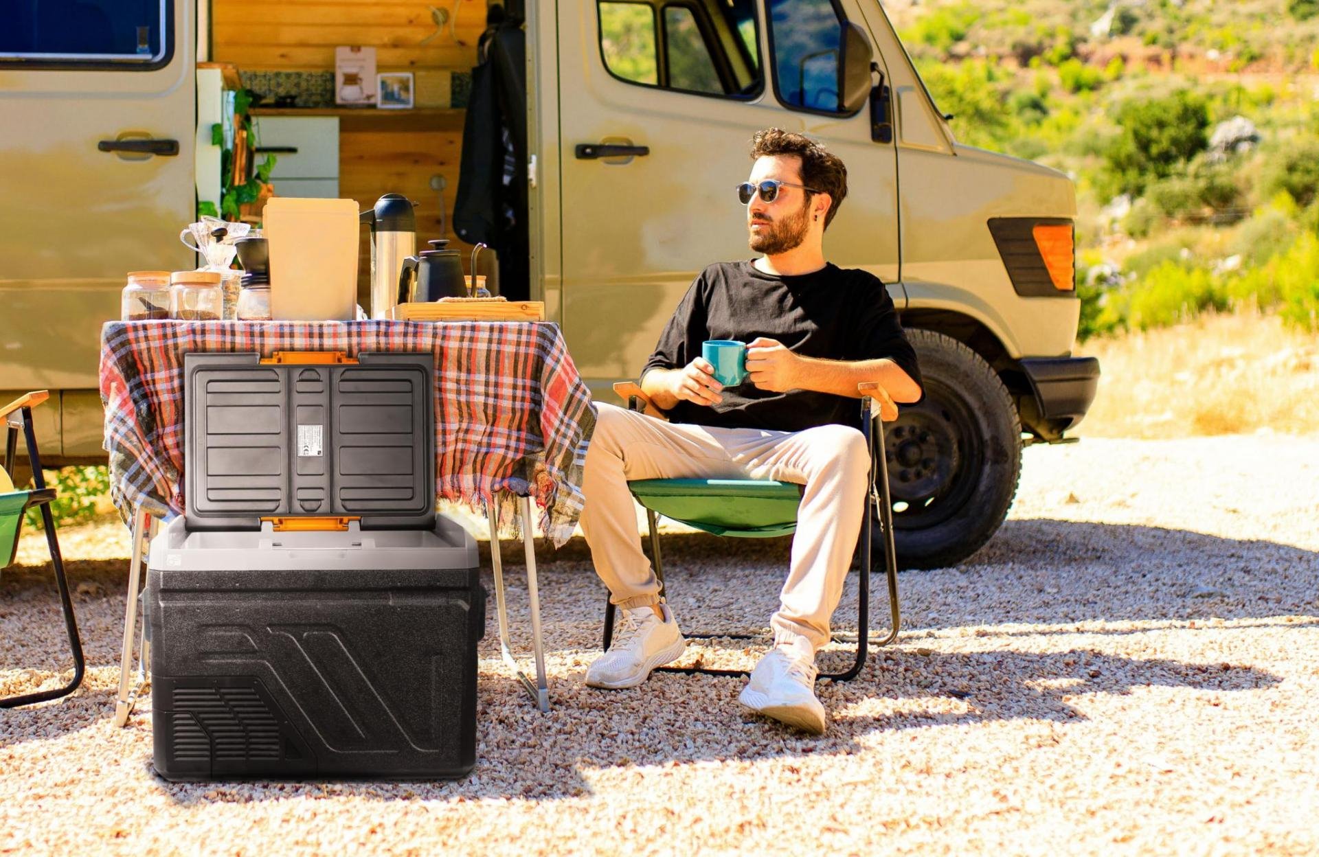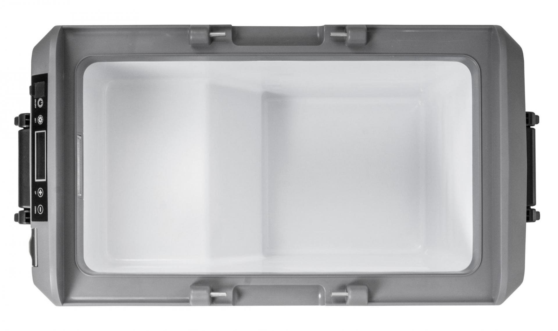 Kompresorová autochladnička s využitím v autě i v domácnosti, připojovací kabely na 12/24 V a 240 V jsou součástí balení. Objem 50 l, oboustranně otevíratelné víko, výstupy USB a USB-C, otvírák na lahve.