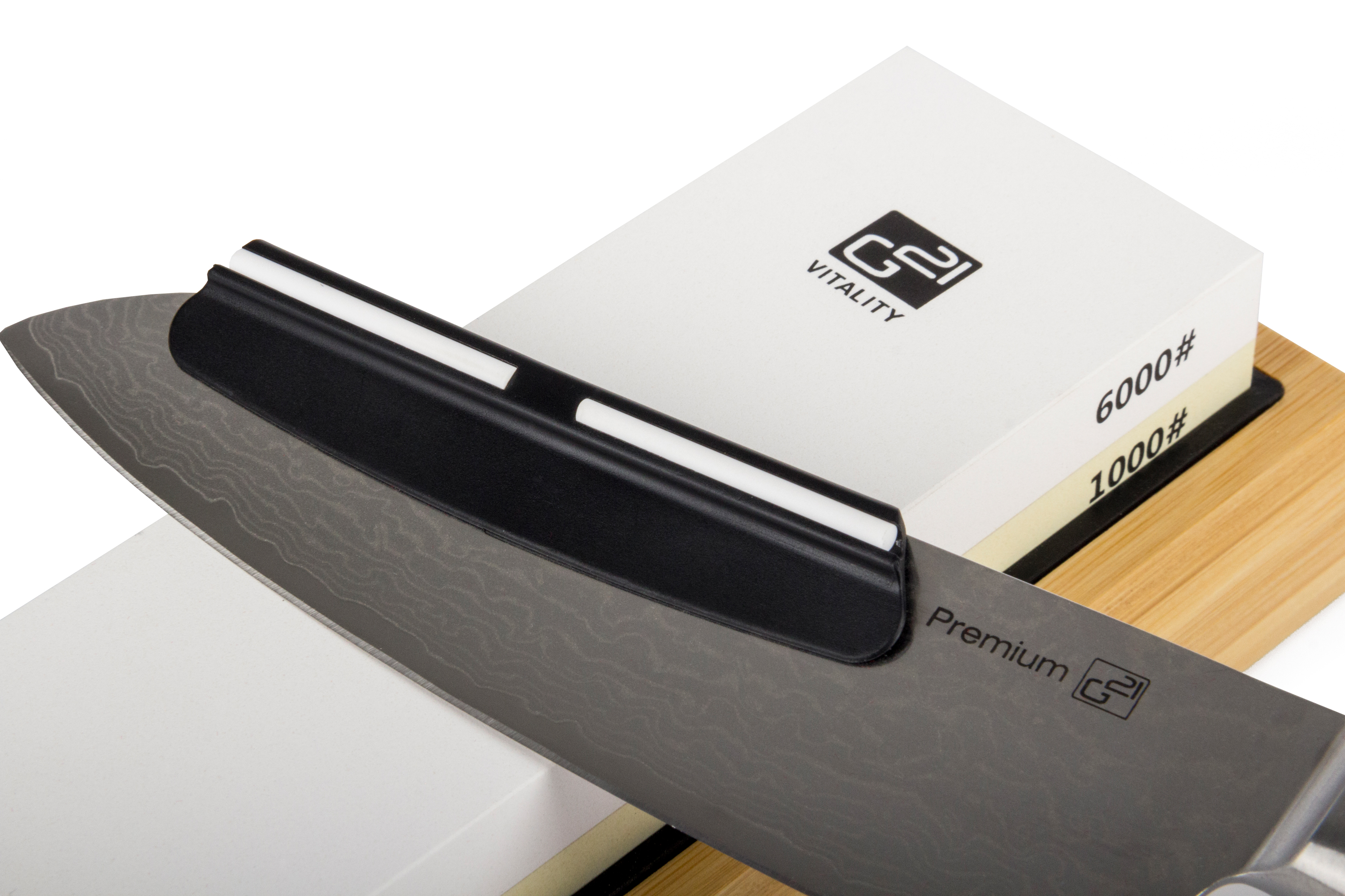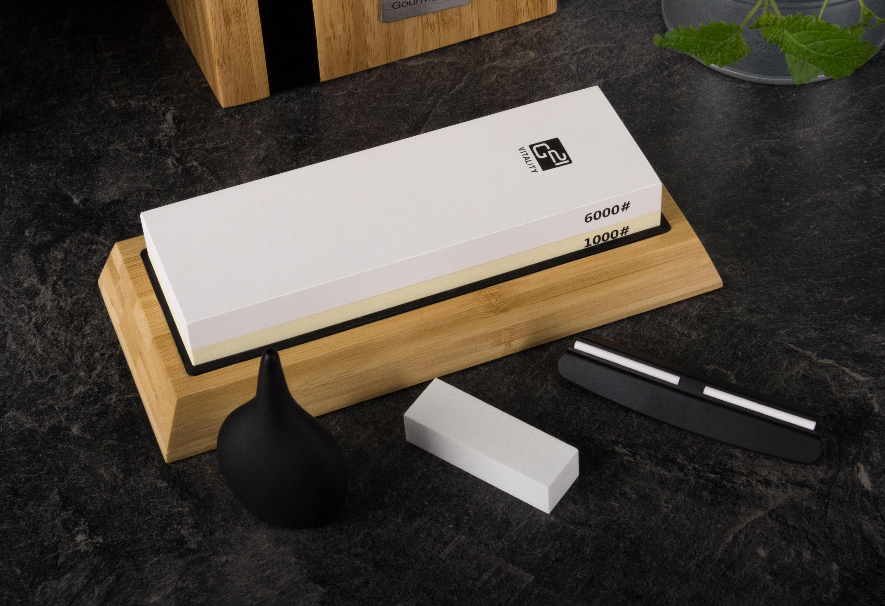 Vysoce kvalitní korundový oboustranný brousek s tvrdostí 1000 a 6000 pro dokonalé broušení nožů. Brusný kámen je v bambusovém bloku, v balení je i vodítko pro přesný úhel a hladítko pro srovnání povrchu a balonek pro dávkování tekutiny.