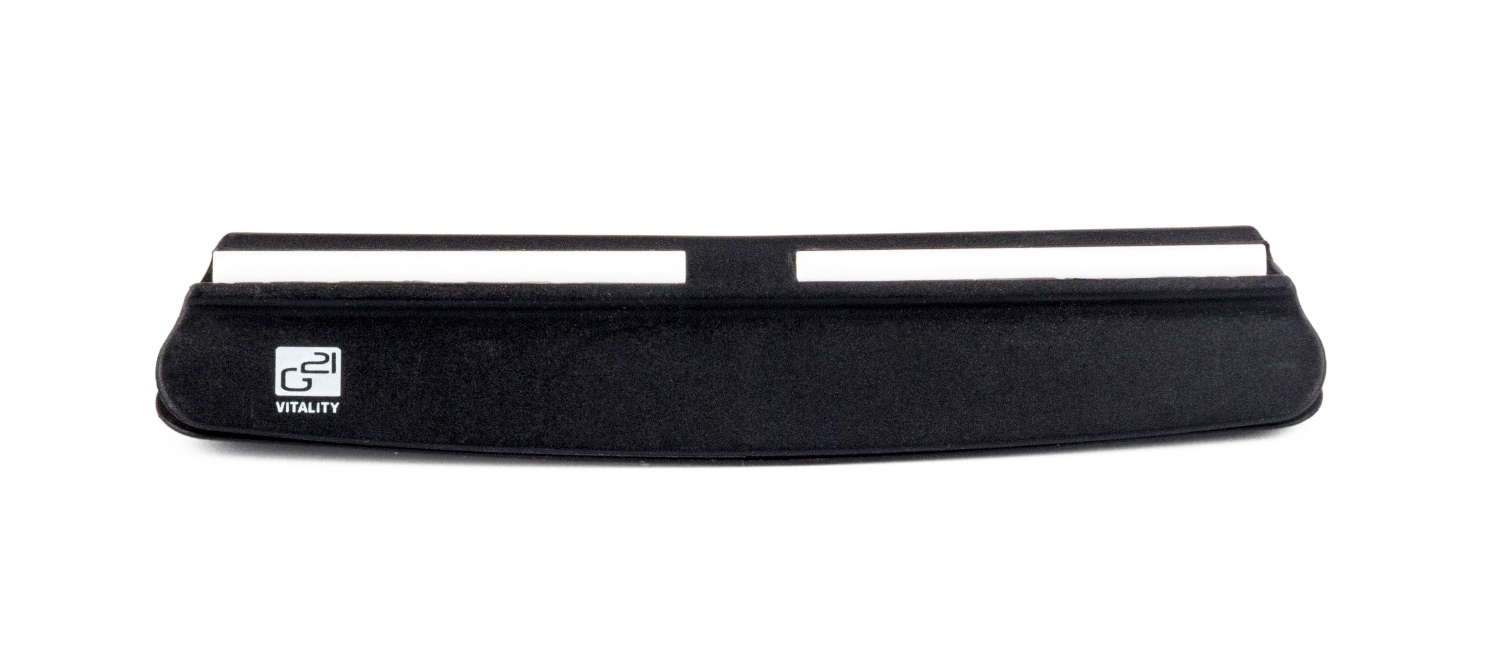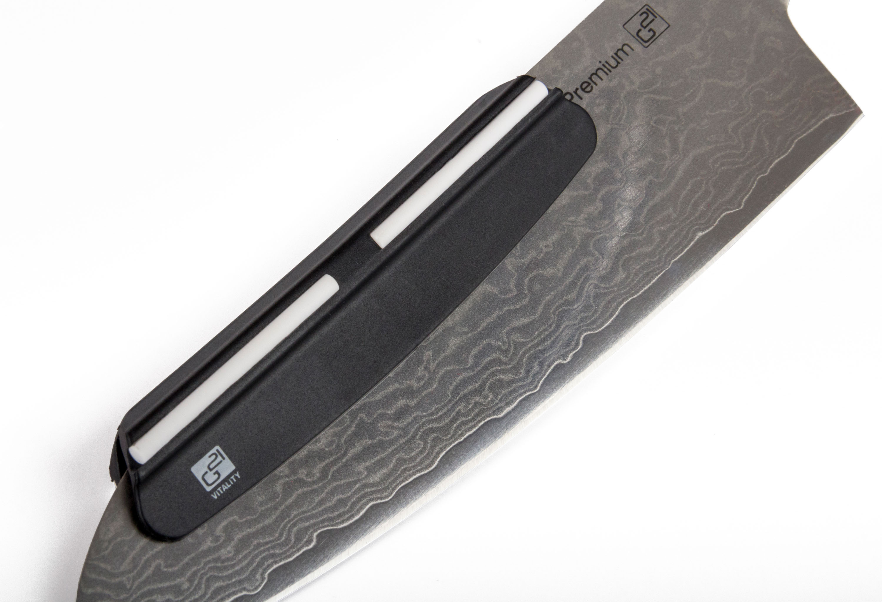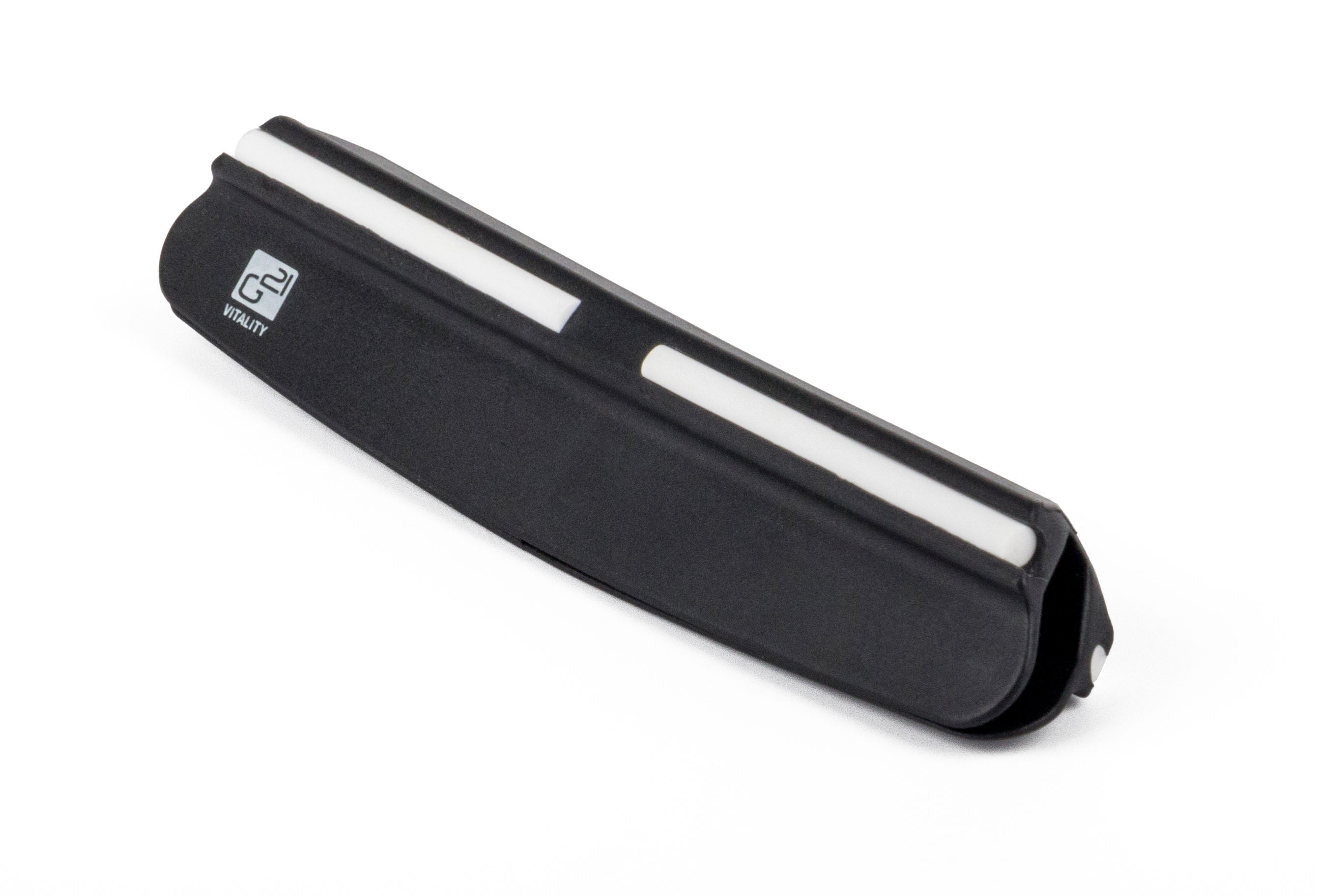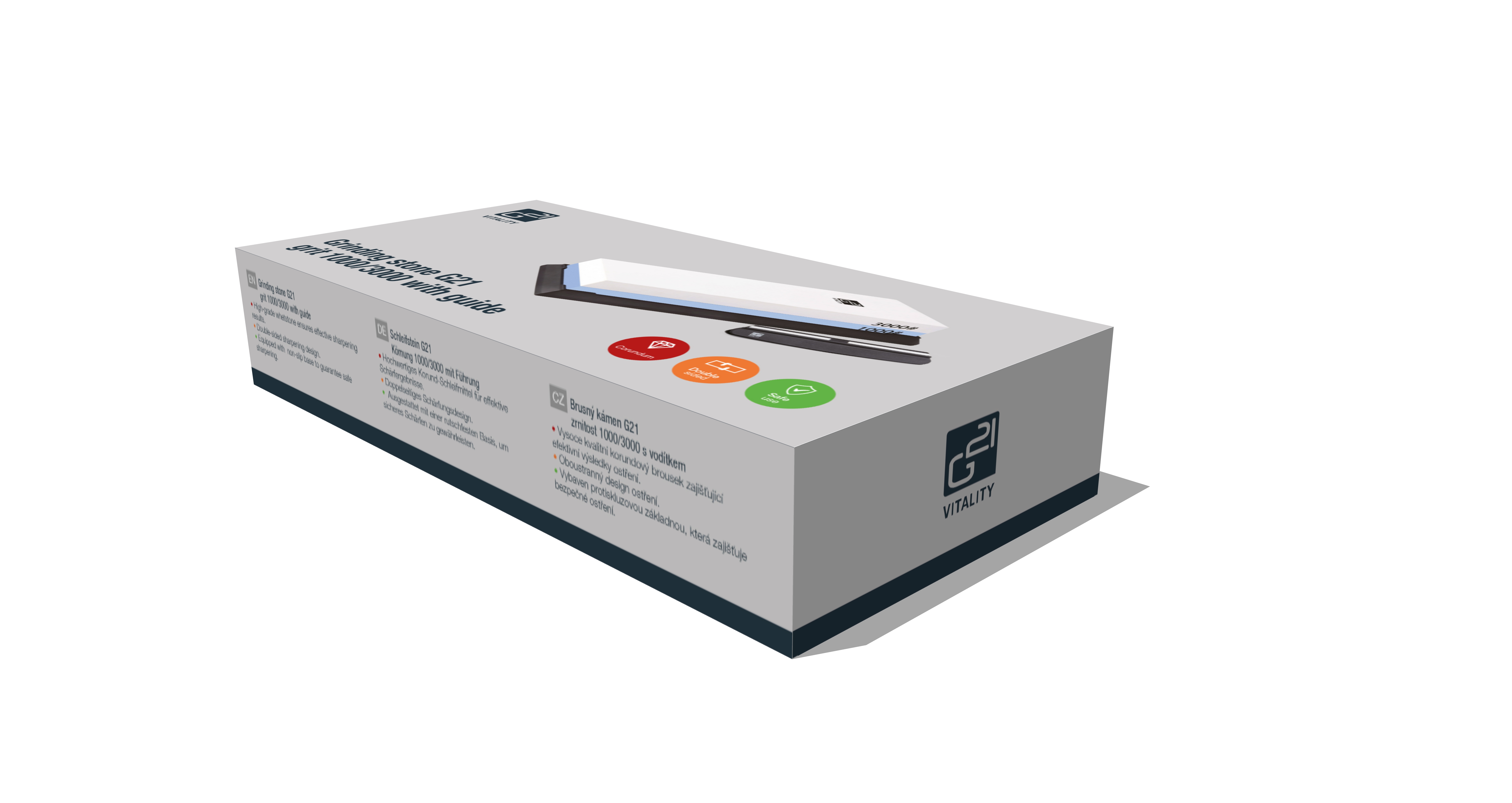 Brusný kámen z korundu je uložen v silikonovém bloku s výřezem na míru. V balení naleznete i šikovné vodítko s nastaveným úhlem broušení (15 °).