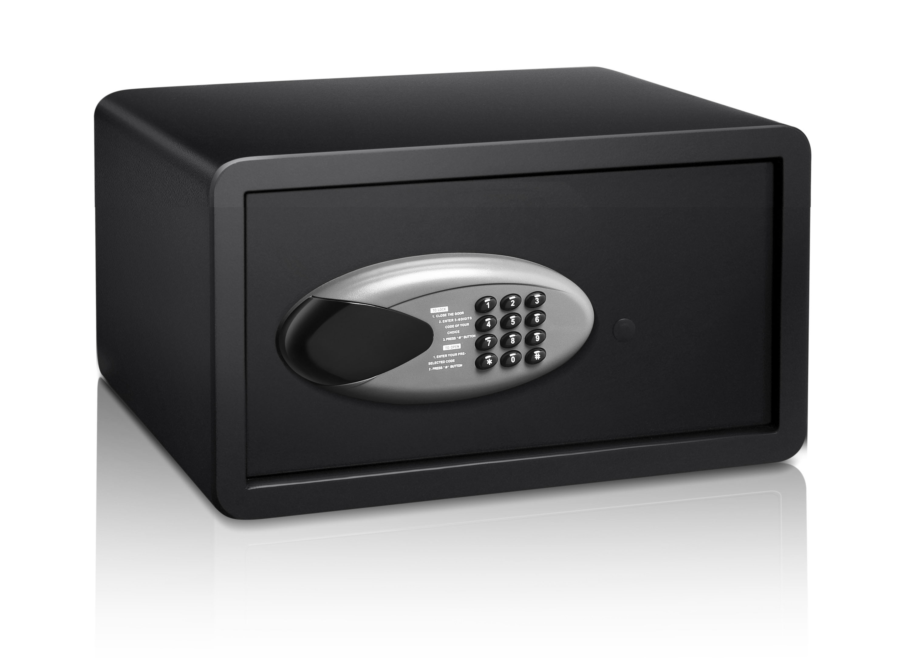 Pro bezpečné uzavření je trezor opatřen digitálním zámkem s číselnou kombinací a informačním LED displejem. S pomocí přiloženého návodu si snadno nastavíte vlastní 6místný kód. Na digitálním zámku trezoru lze také nastavit datum a čas. Na displeji lze poté v případě potřeby zkontrolovat až 105 záznamů o otevření trezoru. Pro nouzové otevření trezoru jsou kromě digitálního zámku dvířka vybavena také mechanickým zámkem na klíč. V balení najdete 2 klíče pro případ, že byste jeden z klíčů ztratili, nebo chtěli umožnit přístup do trezoru další osobě.