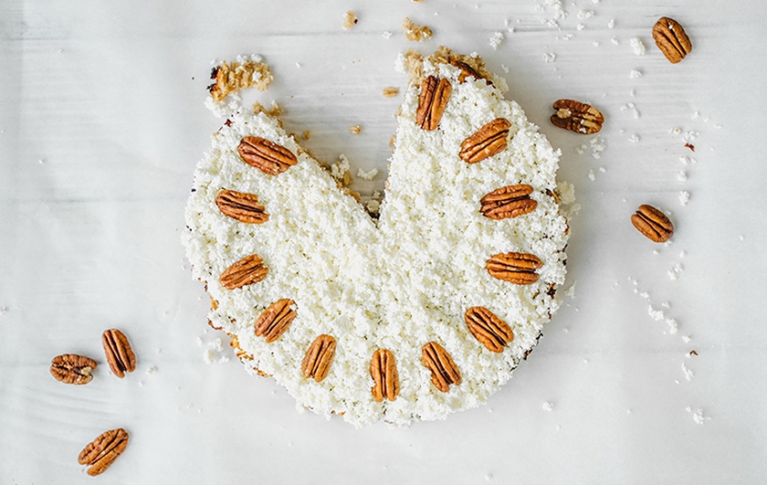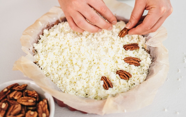 Nakonec posypeme tvarohem a ozdobíme pekanovými ořechy.