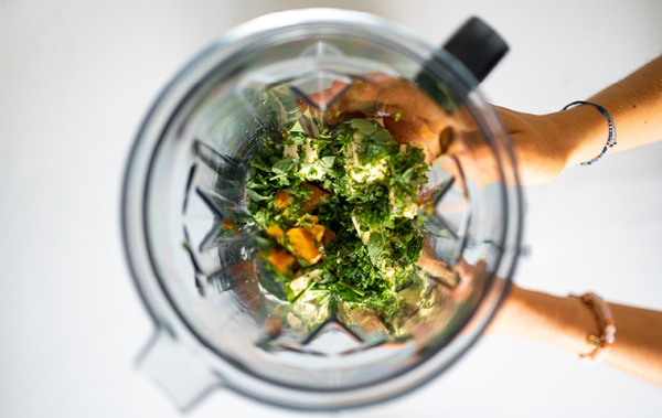 3. Do mixéru vložíme dýni, máslo v pokojové teplotě, přidáme sůl a bylinky.