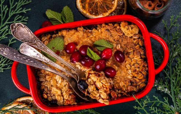 - Drobenku nasypte na brusinkovou směs a pečte asi 25–30 minut, dokud povrch nezezlátne. Podávejte teplé, ideálně se zmrzlinou nebo šlehačkou.