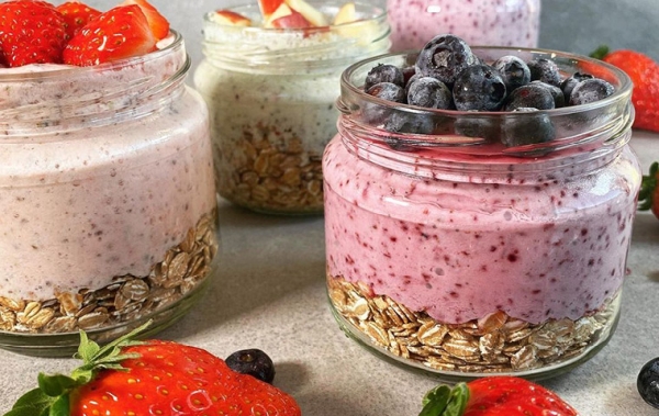 Dále si připravíme skleničku, kterou z jedné třetiny naplníme ovesnými vločkami, přelejeme rozmixovanou jogurtovou směsí, promícháme, uzavřeme a takto připravené necháme do rána stát na kuchyňské lince. V této chvíli se v kaši spustí proces fermentace. Ráno můžeme ještě přidat na ozdobení hrstku ovoce, posypat kokosem a můžeme rovnou snídat. Nebo sklenici uzavřeme a takto připravenou snídani si vezmeme kamkoliv na cesty.