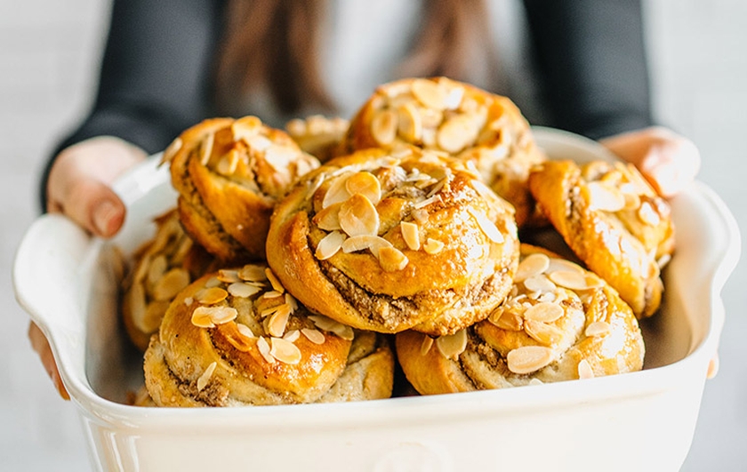 - Těsto si rozválíme na tenkou placku a potřeme ji mandlovou náplní. Dvakrát ji přehneme a lehce přejedeme válečkem. Placku rozkrájíme na 15 stejných proužků. Ty zatočíme a zavineme do šneka. Dáme na plech s pečícím papírem a necháme kynout 30 minut. Motance můžeme potřít agáve sirupem a posypat nasekanými mandlemi.