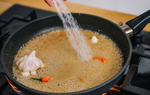 8. Steak dáme stranou z pánve. Do ní přidáme výpek ze sáčku, trochu vývaru nebo vody, svaříme, přidáme pak trochu tamarindu, chili, cukr, rybí omáčku a nakonec máslo.